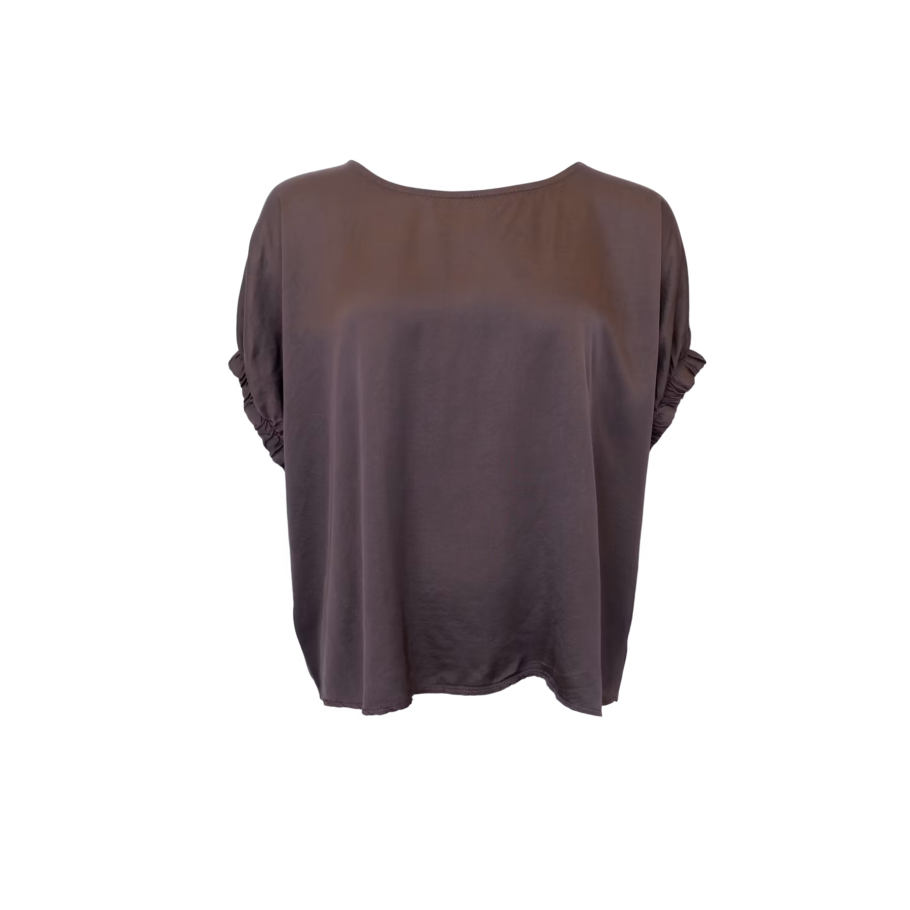 Kortärmad satinblus med resår i ärmslutet, rund hals och en lös passform. Blank och fin! Perfekt topp för både vardag och fest för den är enkel att klä upp och ner. Den är höftlång och boxig, lik Nessa ponchotröjan i modellen, nästan exakta samma mått.
