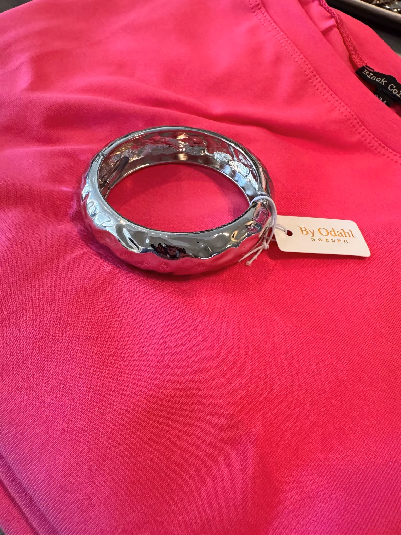 Bangle i metall med gångjärn i ena sidan så den är enkel att ta på och av. Inte alls tung utan lätt på handleden. Snygg att bära själv eller bygga lager på lager med fler armband.