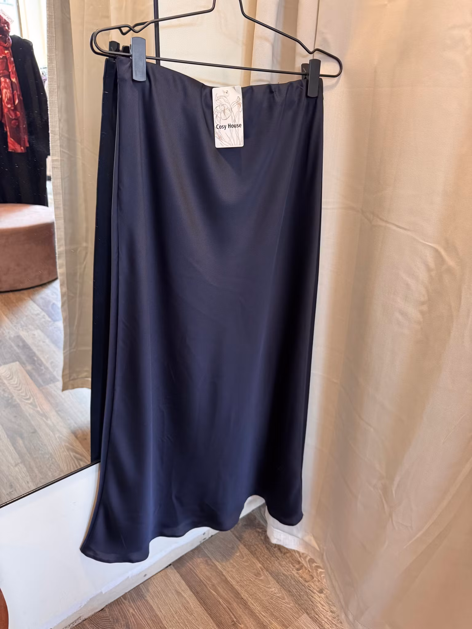 Underbar satinkjol med invändig dubbelvikt resår i midjan så slät upptill. Lika fin till en blus, kavaj och klackar som med en stickad tröja och boots.