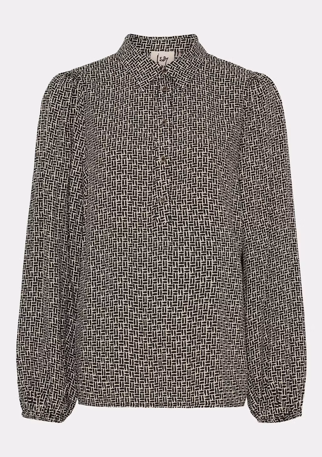 Super fin och skön blus i viskos med klassisk krage, halv knappslå, långa ärmar med resårband som gör ärmarna lite puffiga. Fint grafiskt mönster som passar till alla enfärgade nederdelar, jeans som kostymbyxor. Den har en normal passform, pendlar du i storlek har dem flesta valt sin mindre.