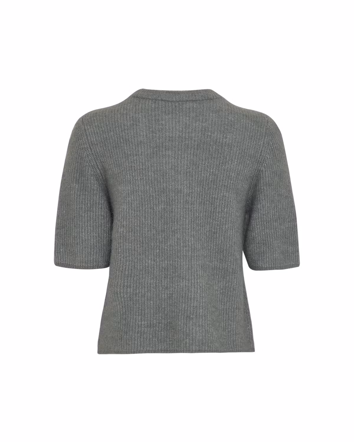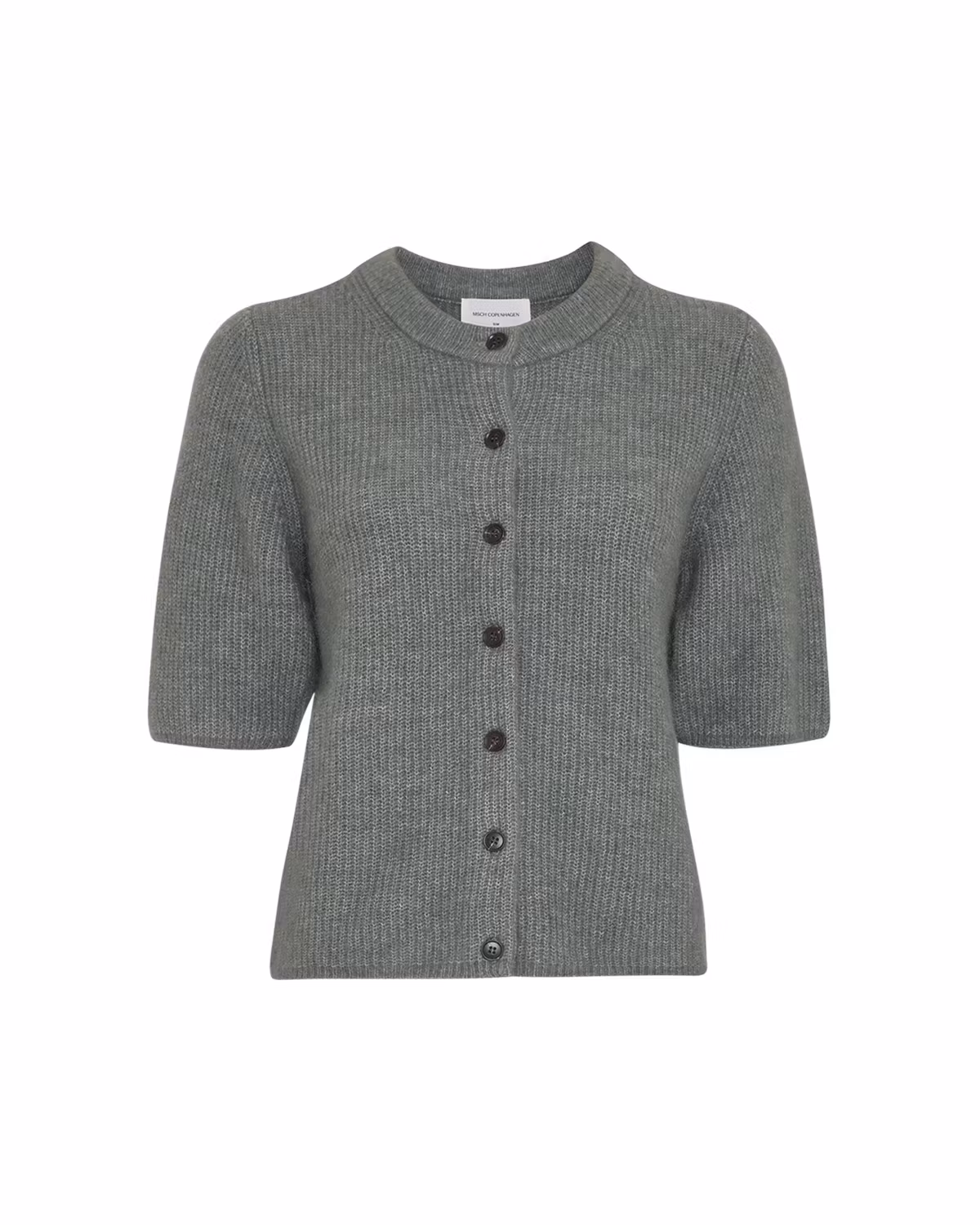 Kortärmad ribbstickad kofta med mörka knappar framtill. Lika snygg att bära som en topp eller som en kofta öppen med ett linne under. Super mjuk och skön.