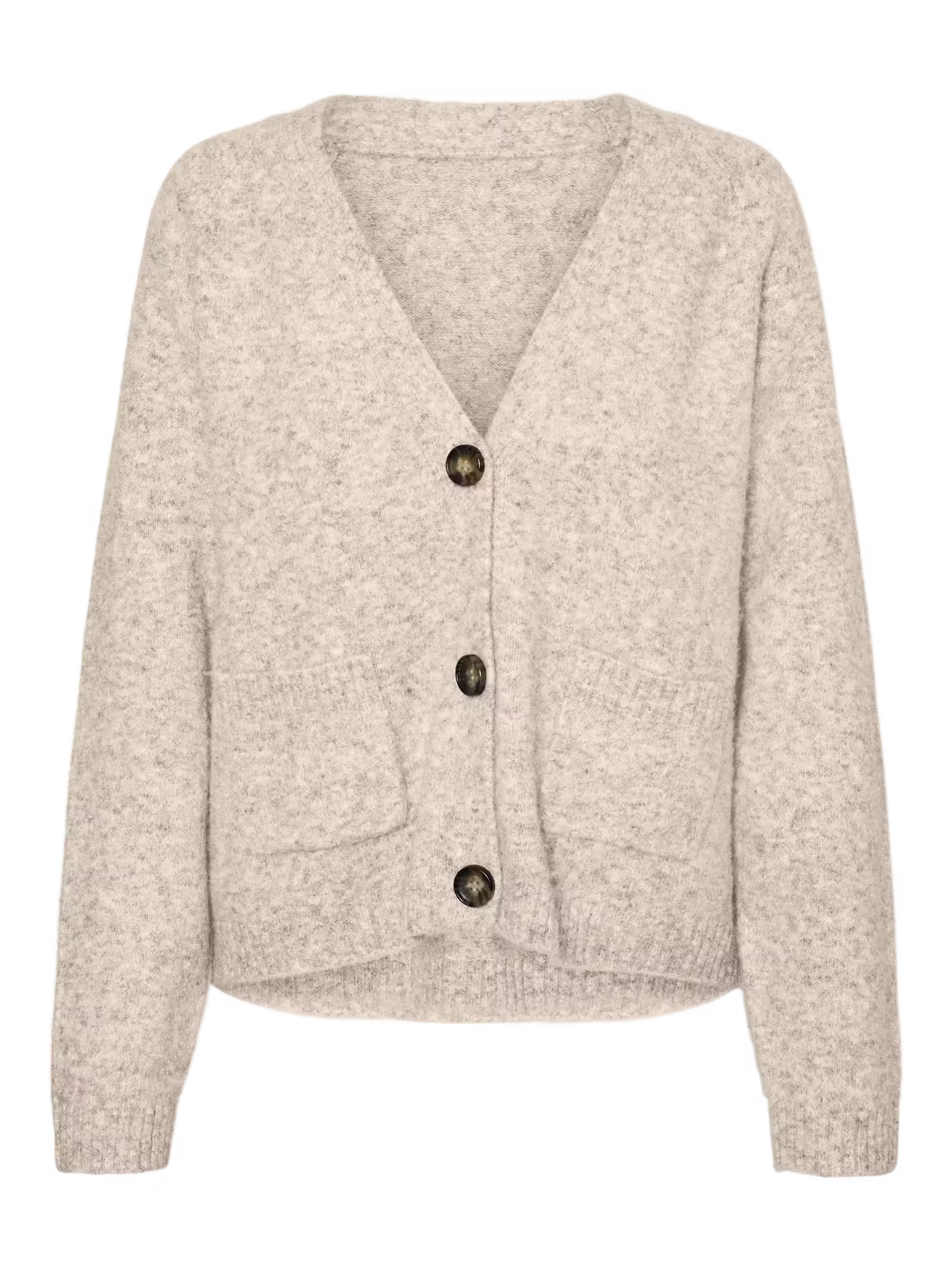 En V-ringad kofta i mjukt material med tre stora knappar framtill, raka ärmar och två framfickor. Fin ribbad kant nertill på kofta och ärm.