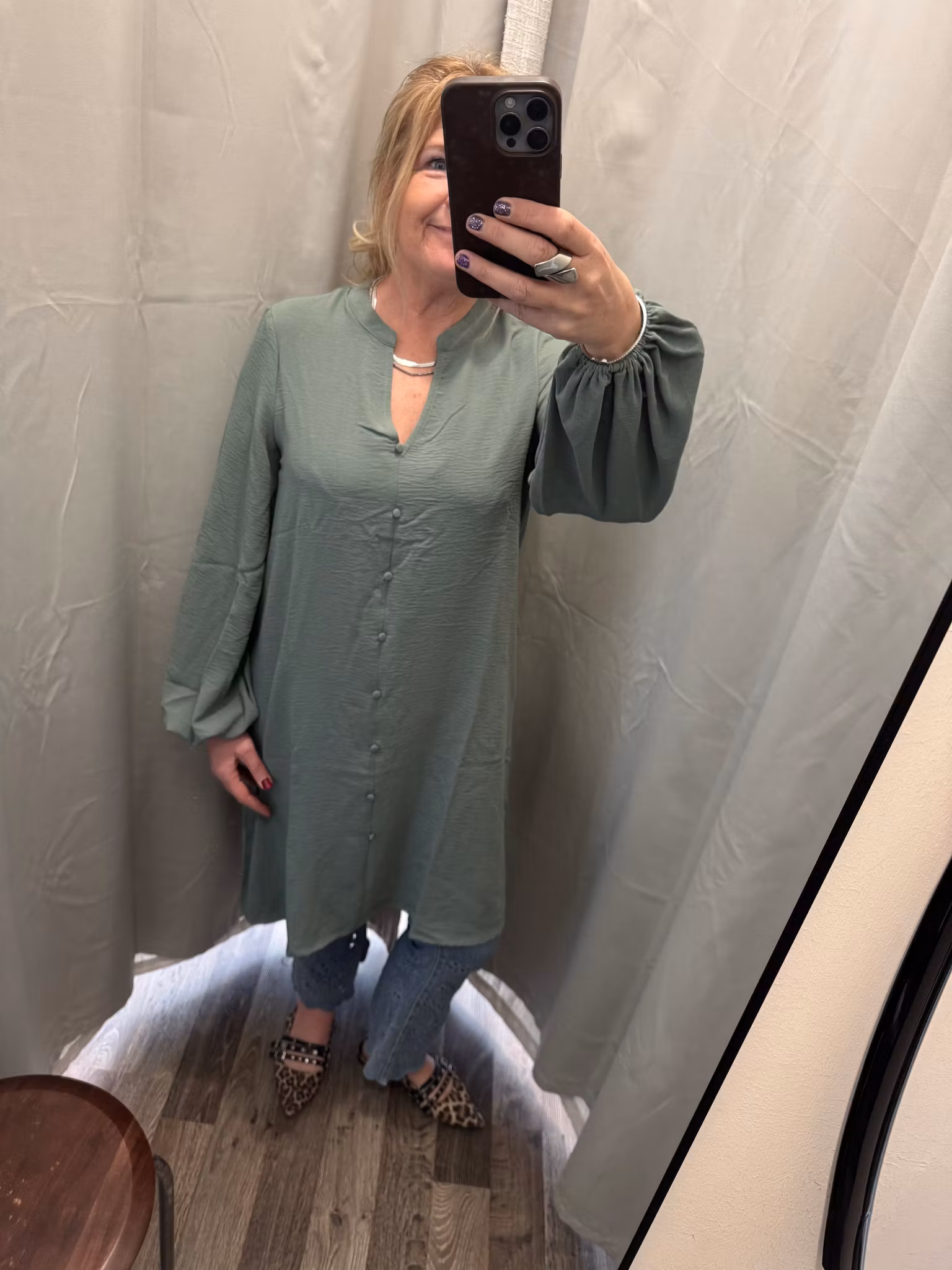 Luftig klänning med lätt krinklad struktur, V-ringning, vida ballongärmar med resår i ärmsluten, fuskknäppning framtill och en härlig lös passform. Rymlig i storleken, du som pendlar tar din mindre, du kan gå ner en hel storlek om du vill.