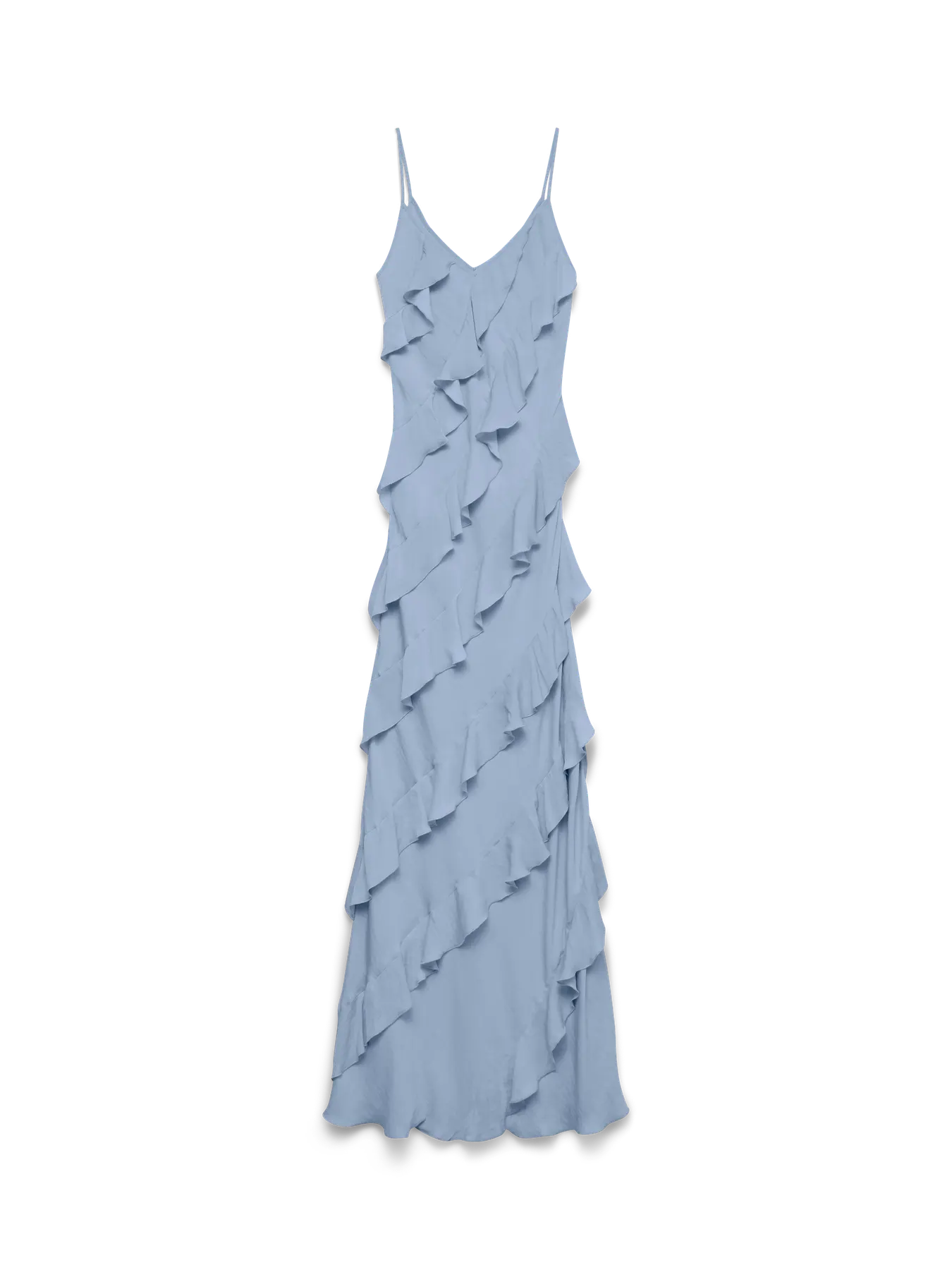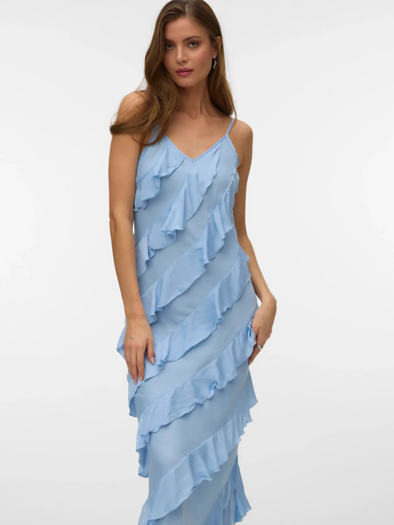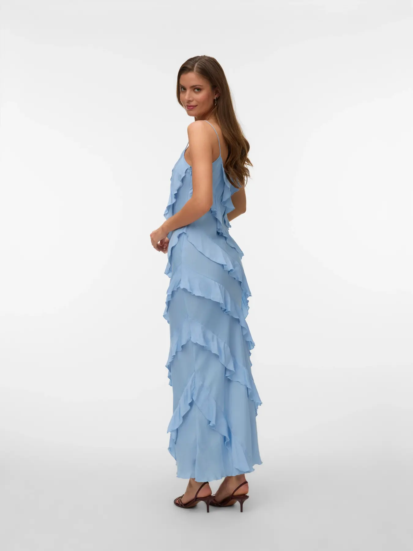 Blank maxi klänning med V-ringning, smala spagettiband och ljuvliga volanger som går diagonalt på både framsidan och baksida av klänning. Klänningen har dragked