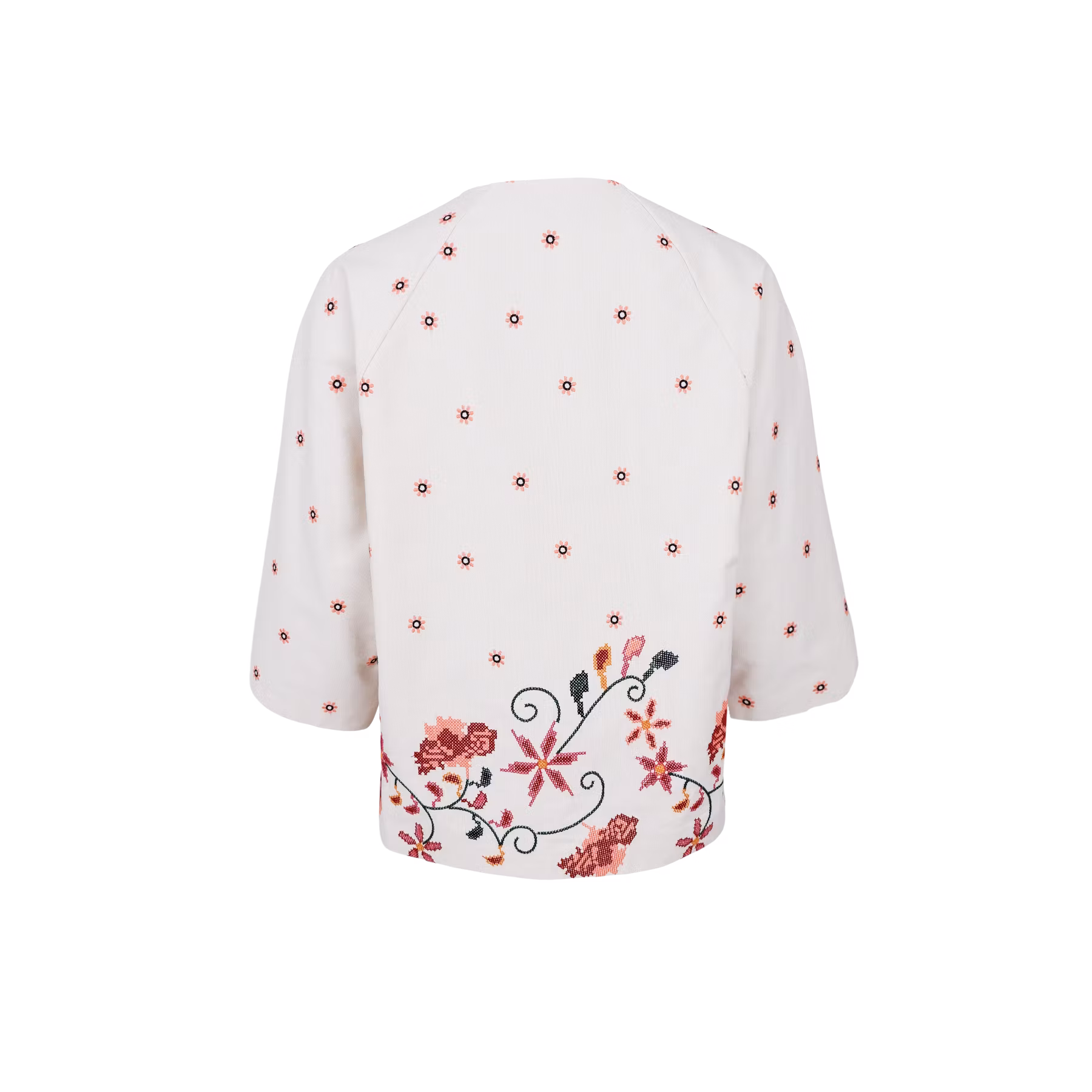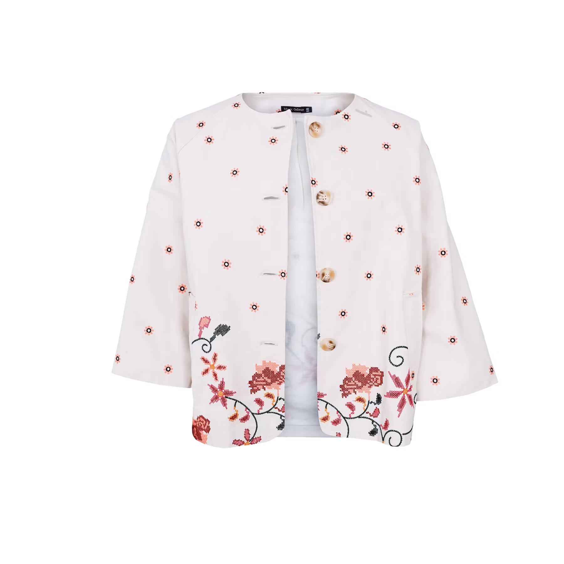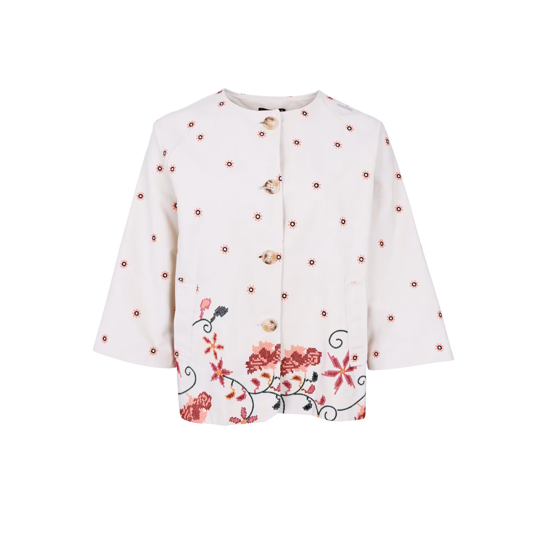En bomullsjacka med raka ärmar, rund hals, fickor framtill och höftlång. Vacker brodyr på hela jackan! Normal i storleken.