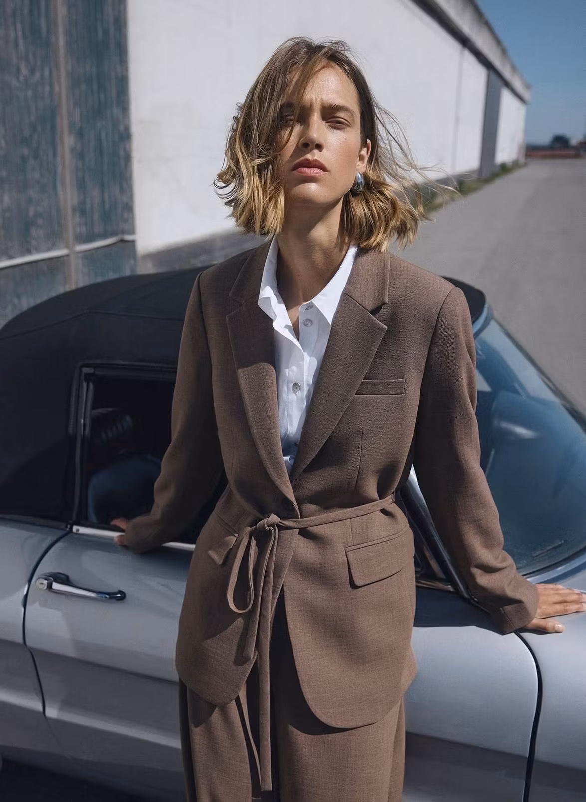 Kavaj med fint slag, framfickor med ficklock, lite axelvaddar och ett bälte i midjan som man kan knyta eller ta bort och bära den som den är.
