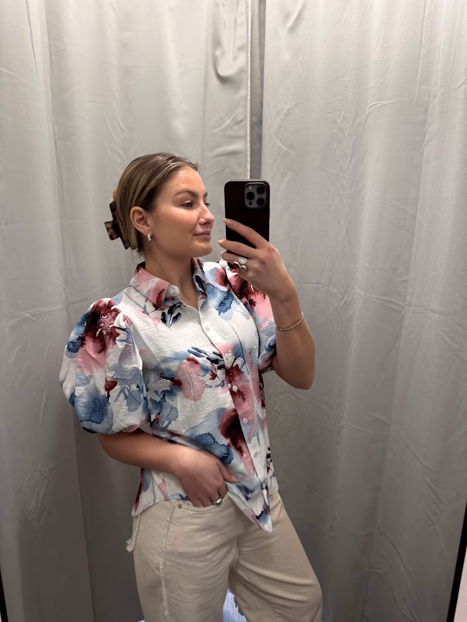 En skjorta/blus med 3/4 ärm, ett blommigt mönster i blått och rosa, klassisk krage och genomgående knappslå. Den har korta puffärmar som tillför volym.