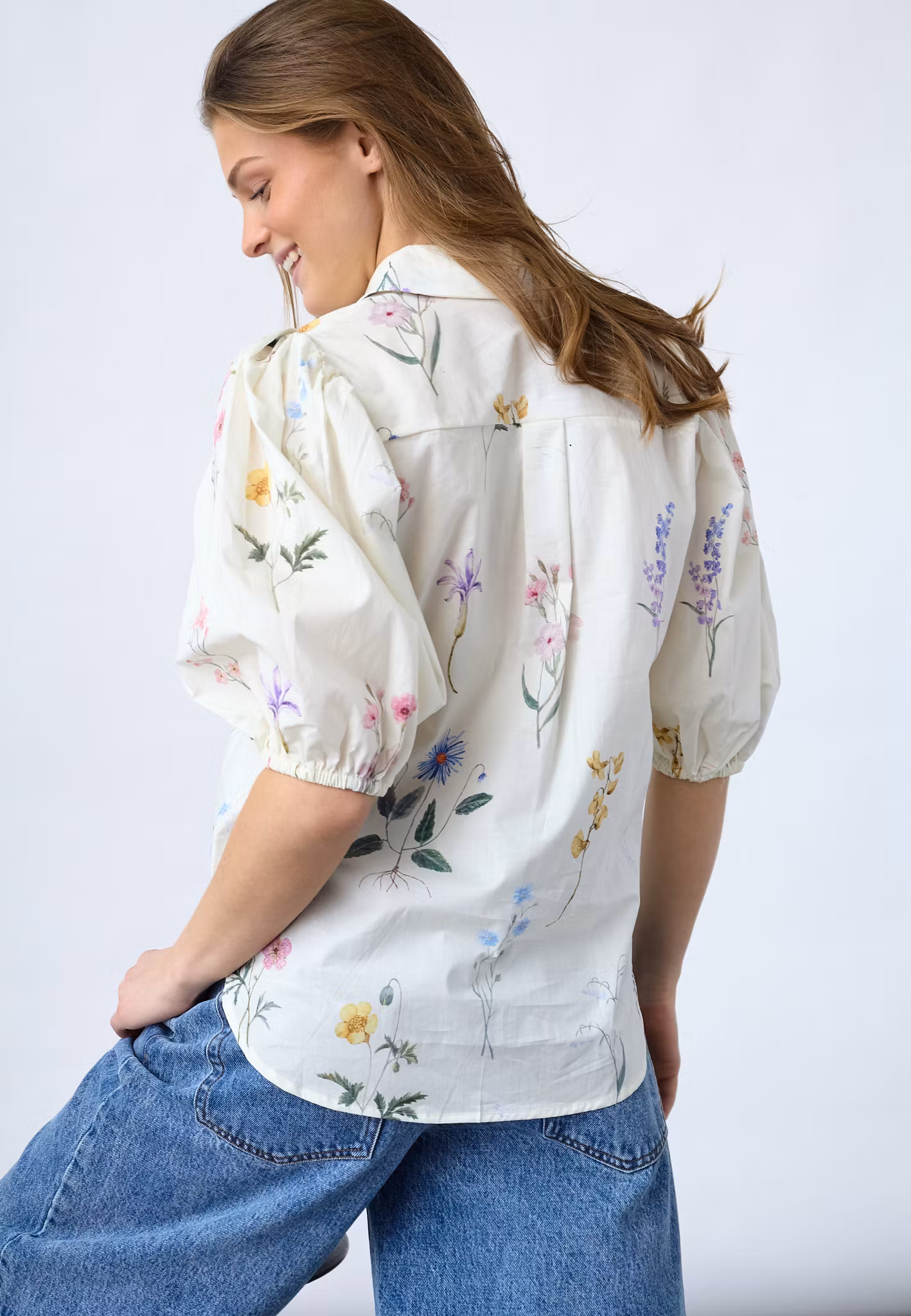 En skjorta/blus med 3/4 ärm, ett blommig mönster på en krämvit botten, klassisk krage och genomgående knappslå. Den har korta puffärmar som tillför volym och en lös passform som gör den bekväm. Modellen har storlek S på sig.