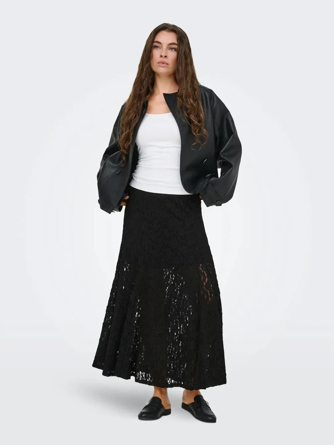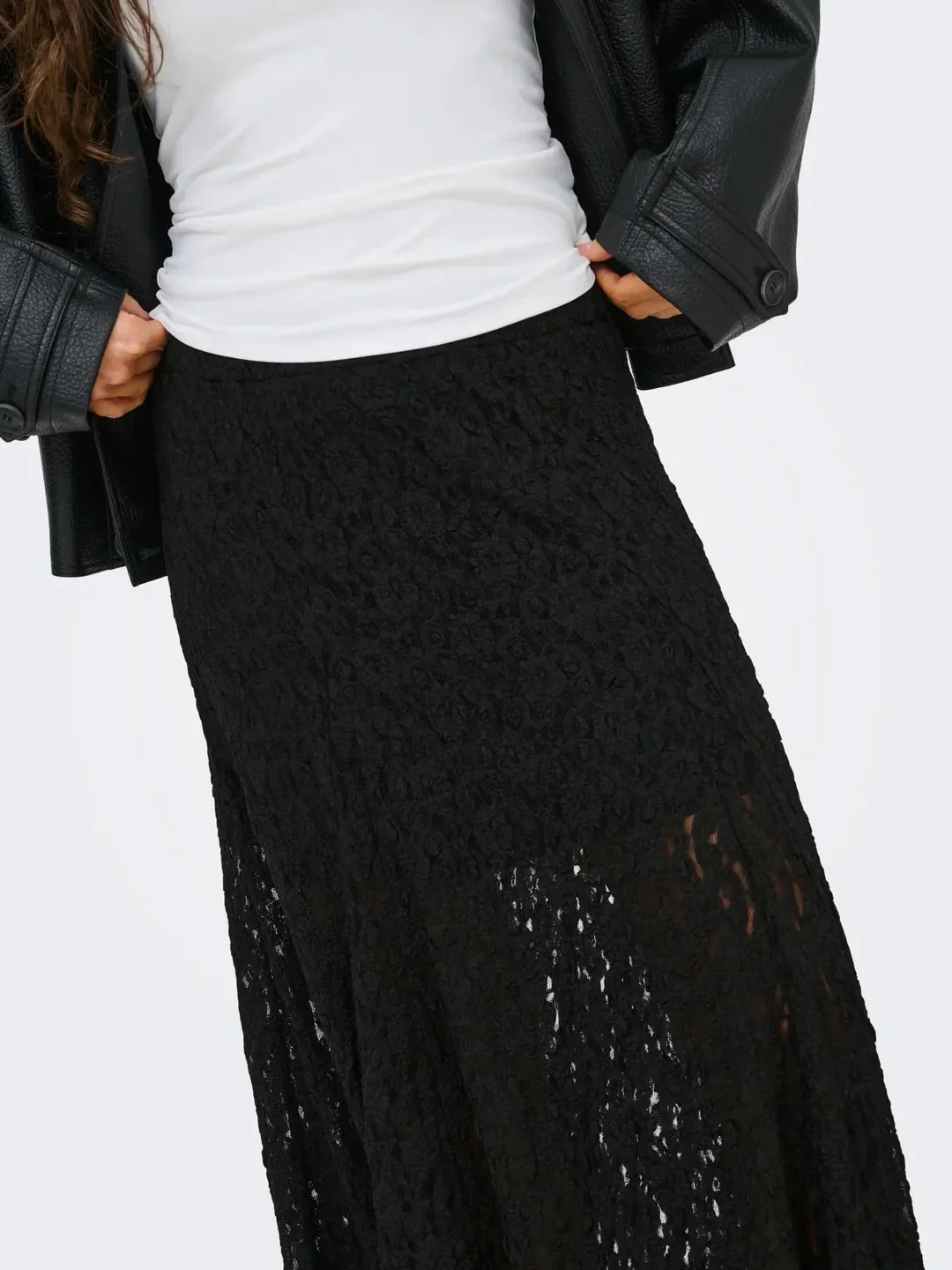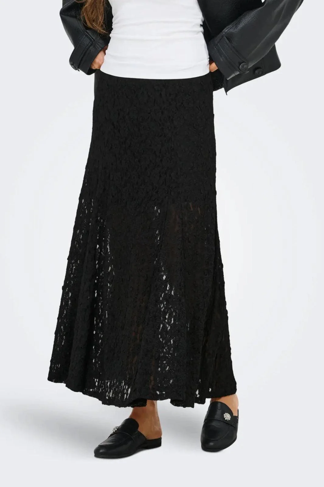 Svart superstretchig kjol i spets med en kort underkjol. Kjolen har ett fint tungt fall, den är något A-formad men faller rakt. Resår i midjan och superskön komfort! Normal till rymlig i storleken, pendlar du i storlek välj din mindre.