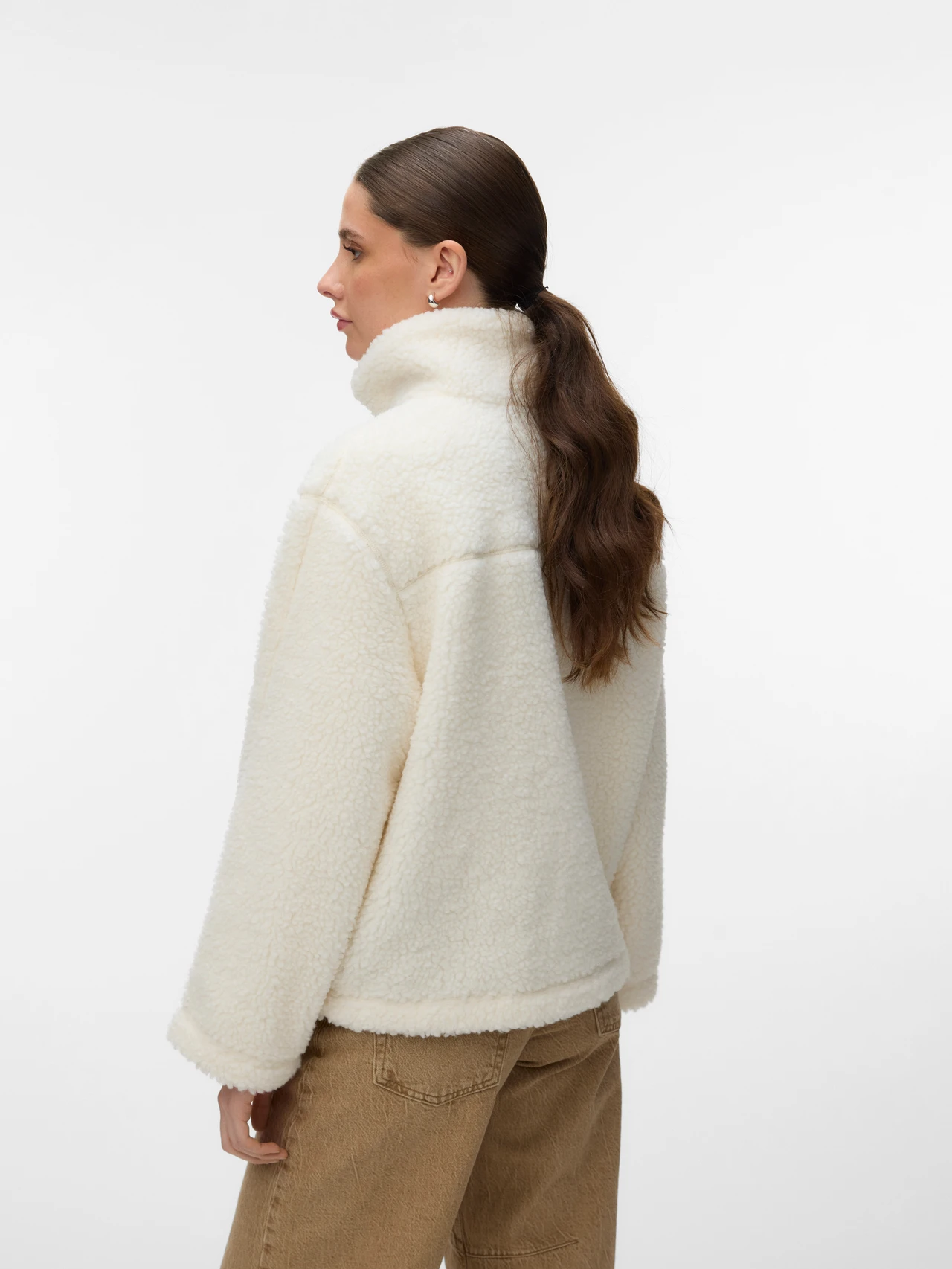 Gosig teddyjacka med dragkedja framtill, lite högre i halsen, raka ärmar, framfickor och fina sömmar som ger en fin detalj till jackan.