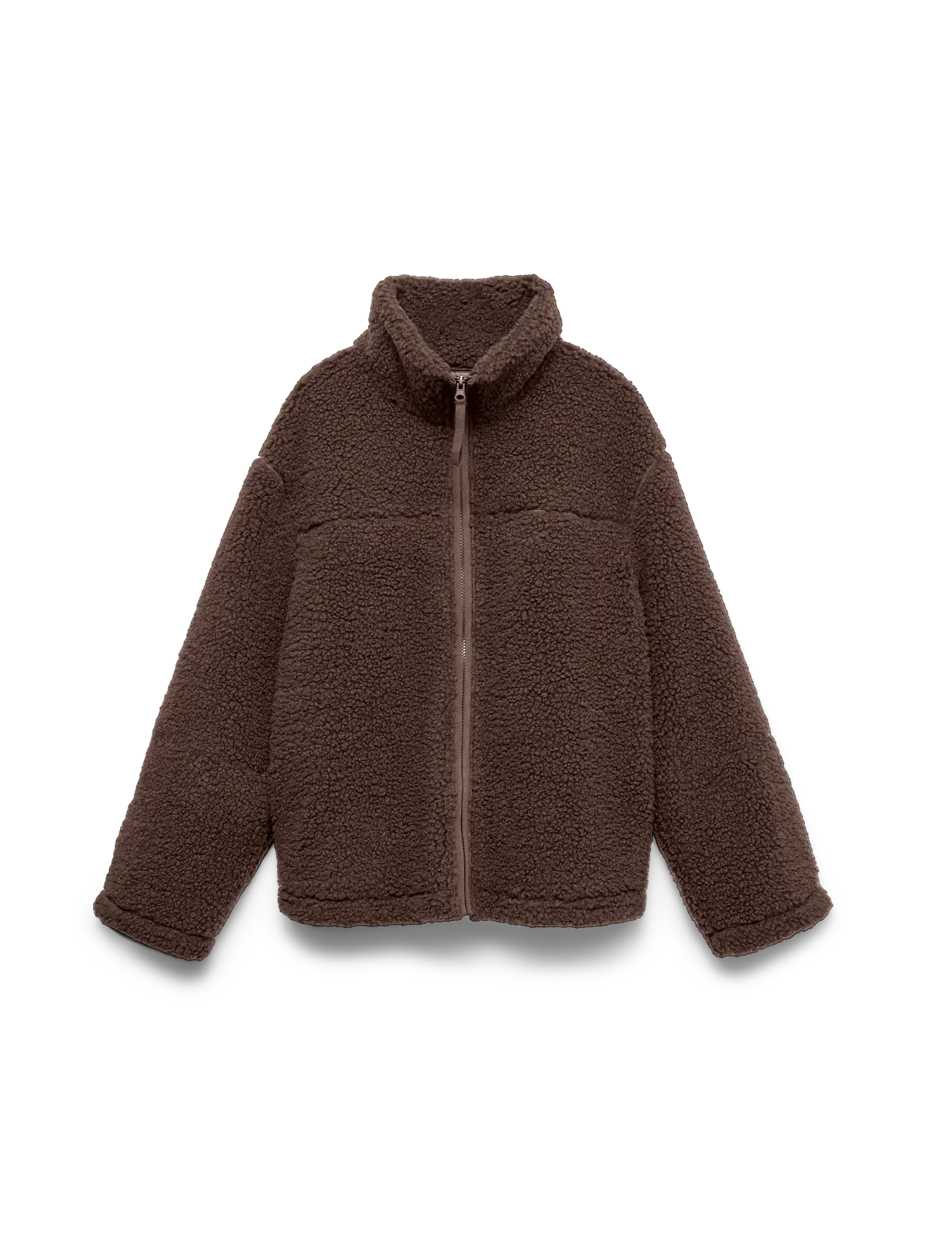 Gosig teddyjacka med dragkedja framtill, lite högre i halsen, raka ärmar, framfickor och fina sömmar som ger en fin detalj till jackan. Perfekt vår- och höstjacka. Normal i storleken men med en rymlig passform.