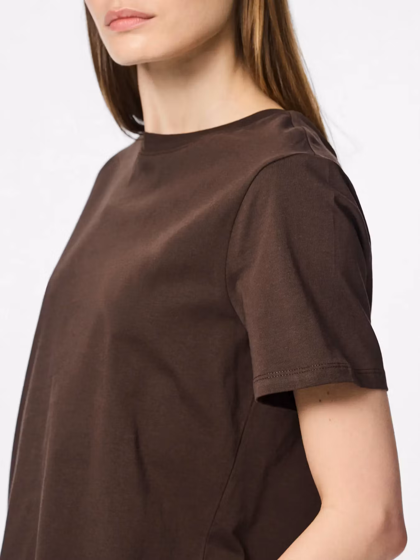 Rundhalsad chokladbrun t-shirt som är höftlång som är i en normal passform så den är inte tajt eller lös. Normal i storleken, pendlar du i storlek kan välja din större om du vill ha en lösare passform och din mindre om du inte vill ha den lös.