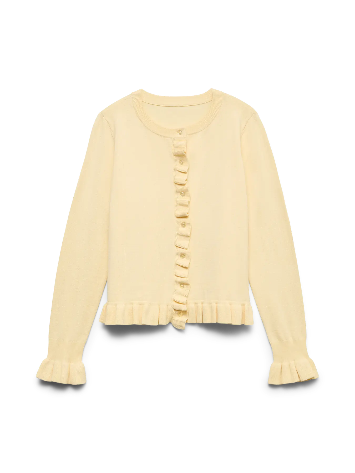 En tätstickad kofta i mjuk kvalitet med frillkant både i ärmslutet, koftslutet och volangkant vid knapparna. Den är höftlång, rundhalsad och knappar i gult.