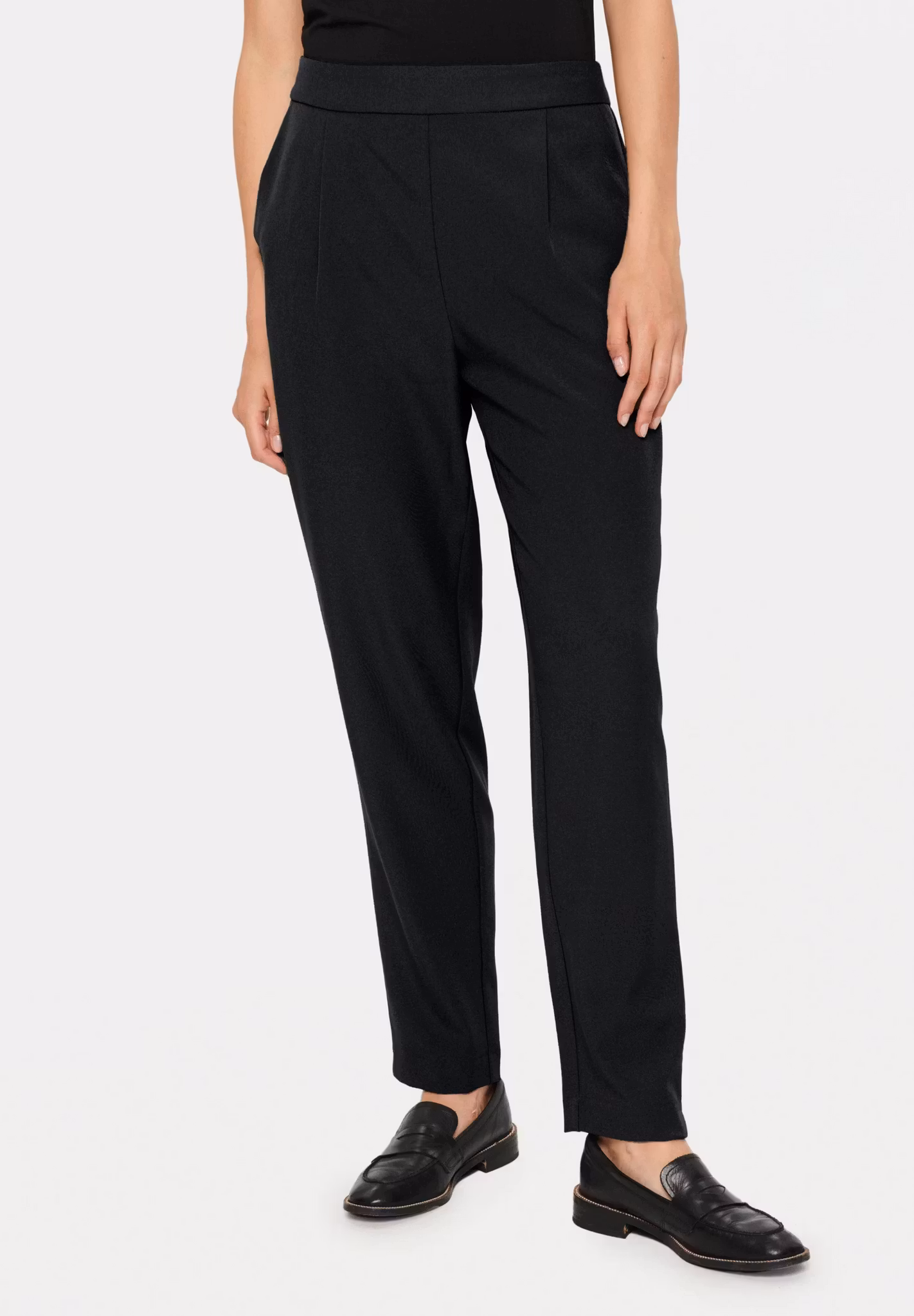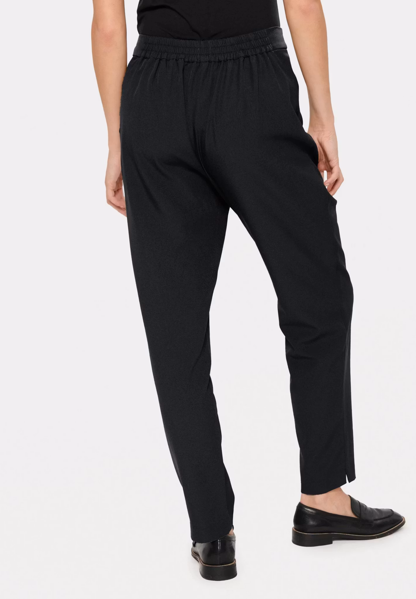 Kostymbyxor med smala ben och lös passform i midjan såkallad ”gubbyxa”. Byxorna har fast linning framtill och resår baktill. Byxorna har snedställda fickor fram