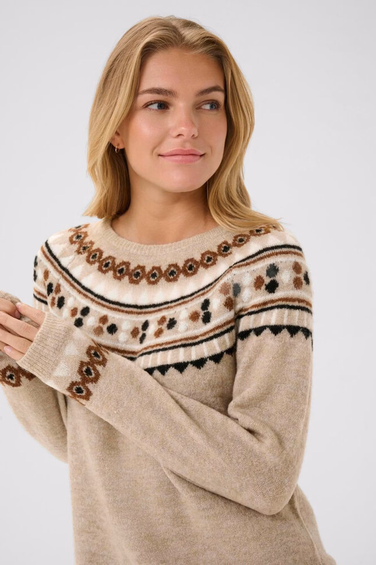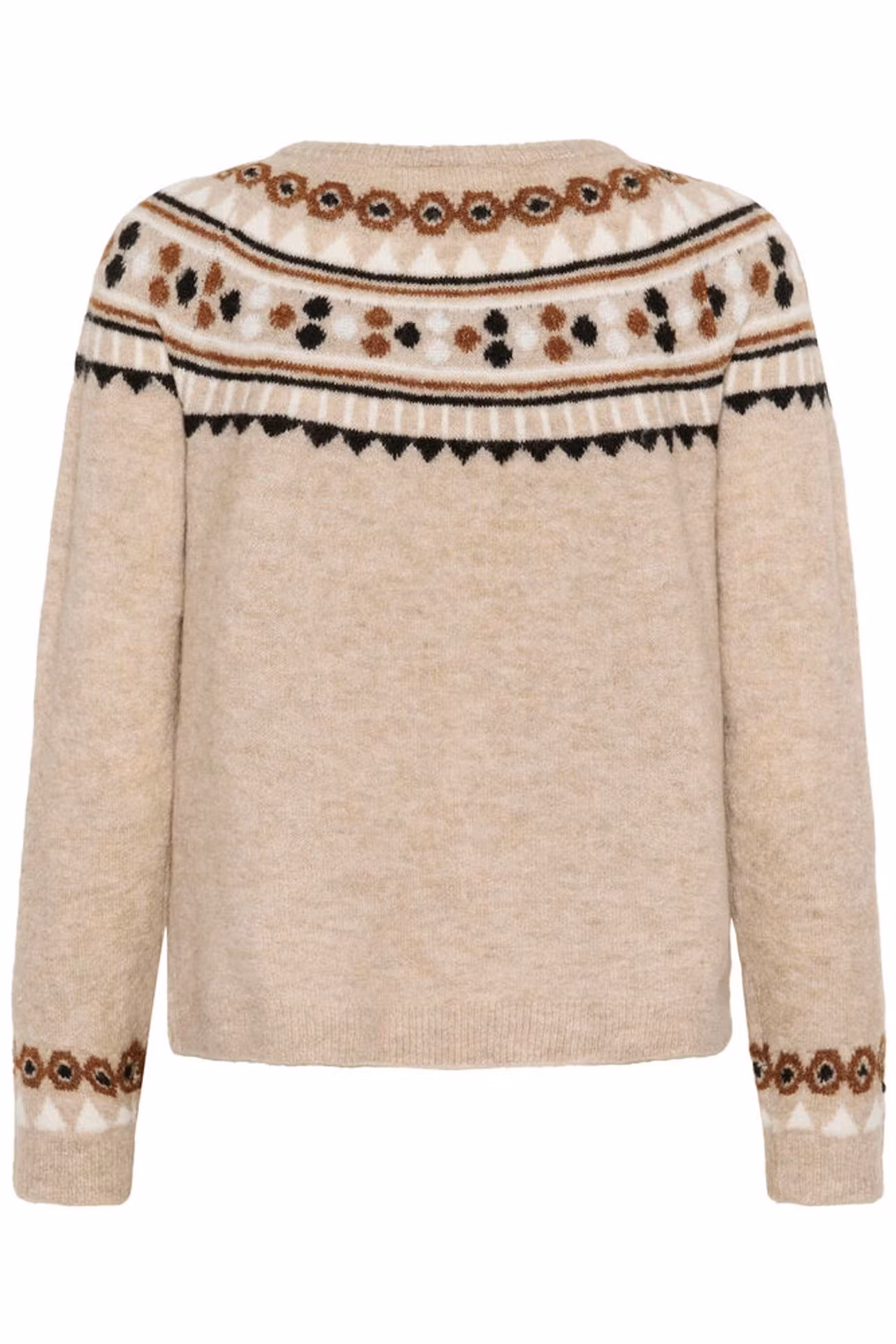 Mjuk stickad tröja med rund hals och långa ärmar. Avslappnad passform för bästa komfort. Dekorativ ok-design gör den perfekt till vardag, jobb och härliga middagar. Passar bra med både jeans, kjol och kostymbyxa. Vi tipsar om att den är helt galet fin till Creams Paloma skinnimitationkjol brun.