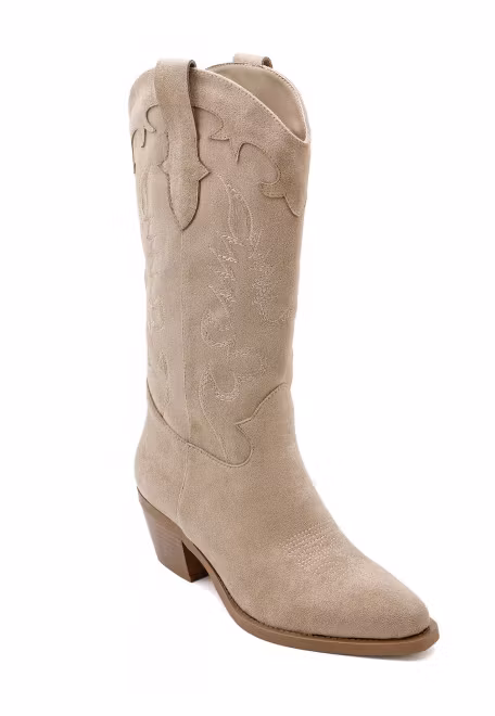 Ursnygga höga cowboyboots i beige mockaimitation, med de klassiska sömmarna på fot och skaft. Bekväma och sköna, normala i storleken.