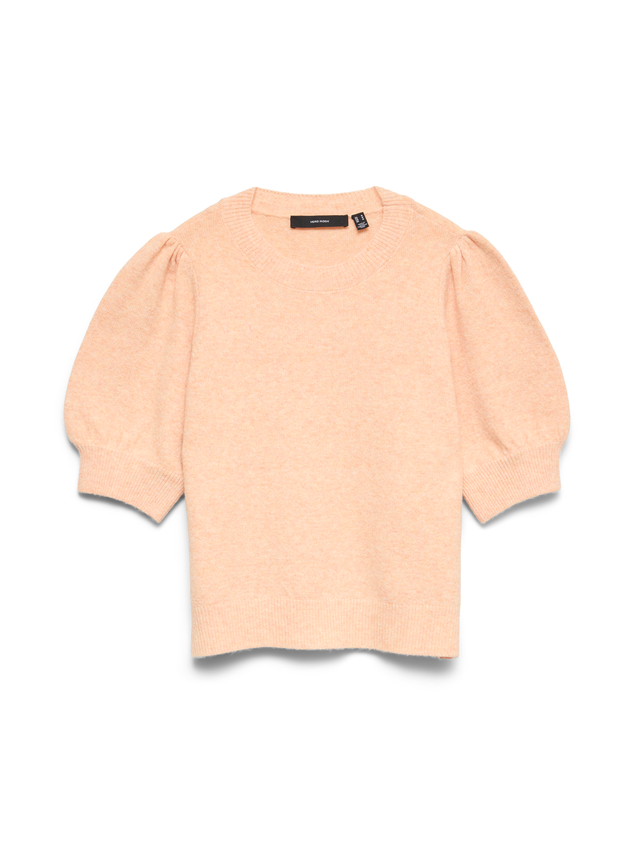 Kortärmad stickad tröja med ribbad rundhals, puffiga ärmar, melerad i färgen och höftlång. Perfekt till kjolar och jeans med lite högre midja.