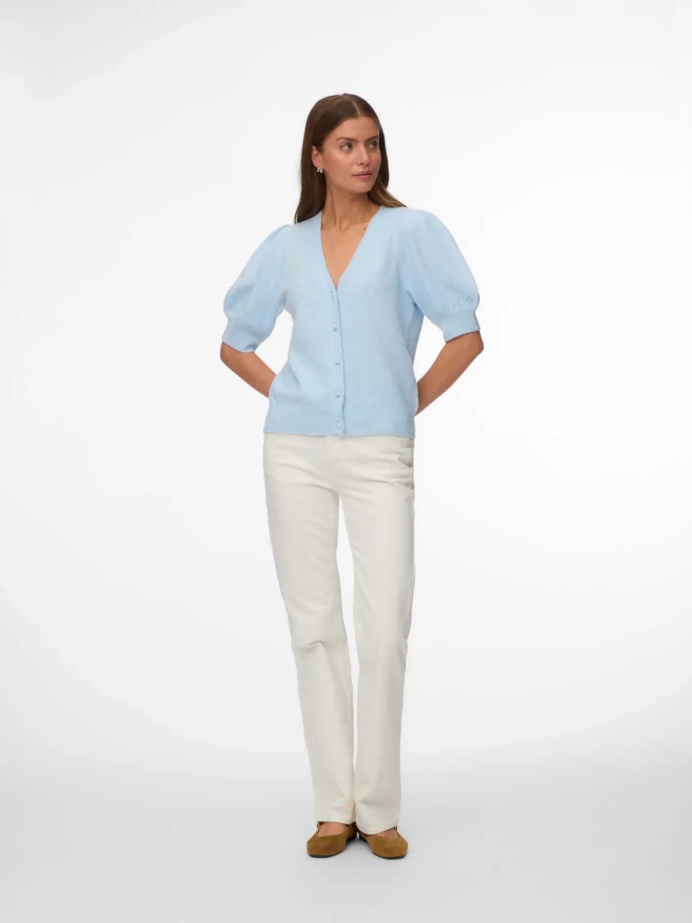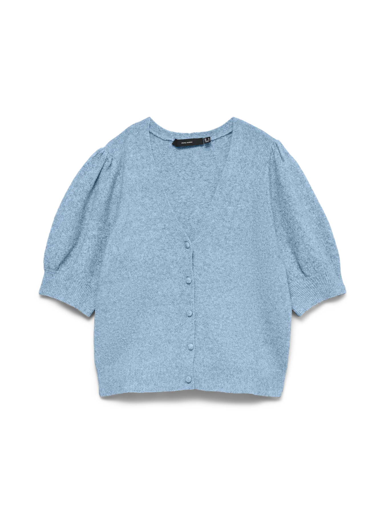 Kortärmad stickad kofta med V-ringning, klädda knappar framtill, puffiga ärmar, melerad i färgen och höftlång. Perfekt till kjolar och jeans med hög midja.