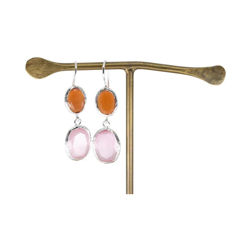 Örhängespar i mässing som förgyllts med silver. Stenarna är av syntetisk cats eye som görs genom en unik glasteknik. 4 cm långa