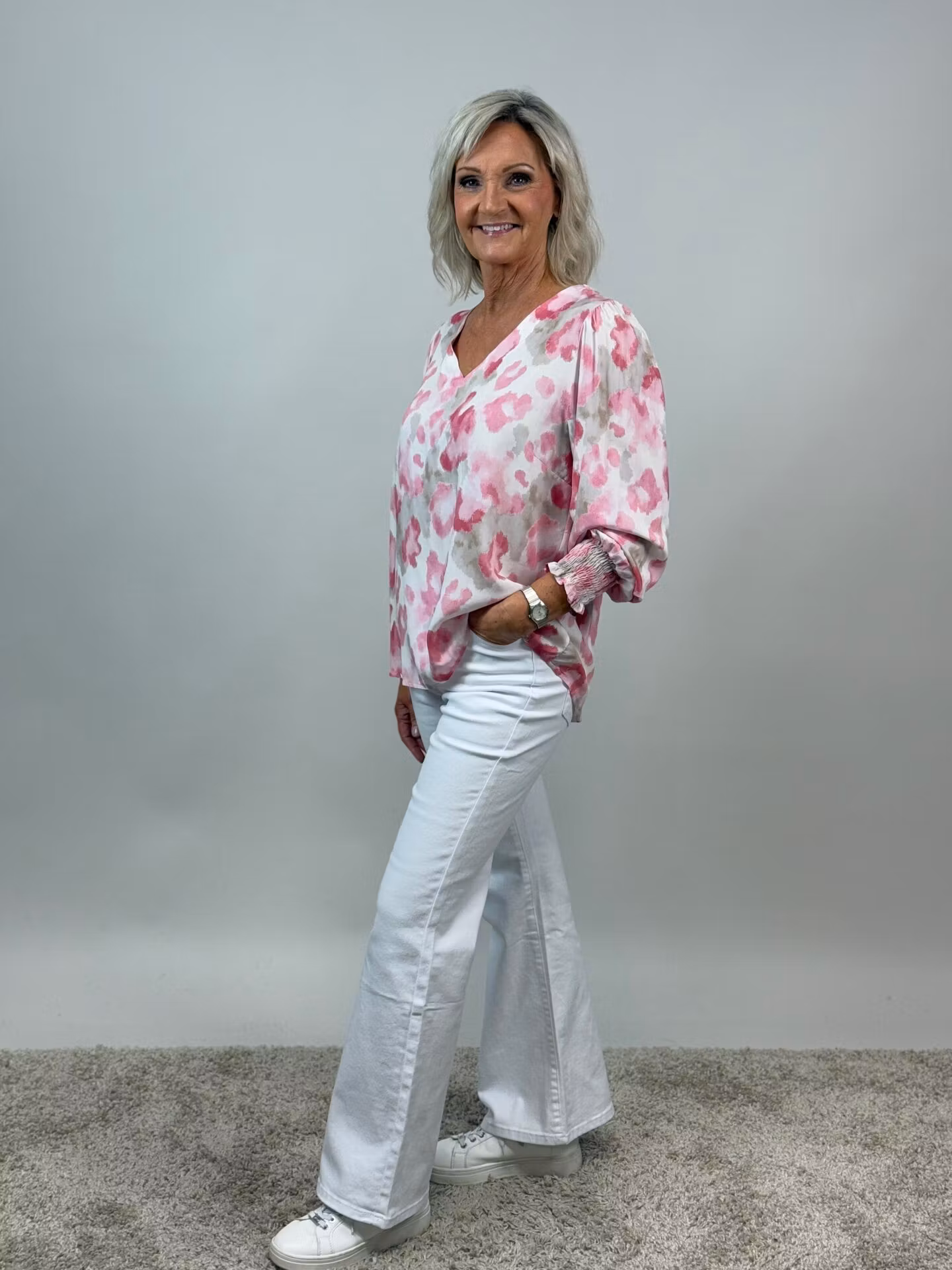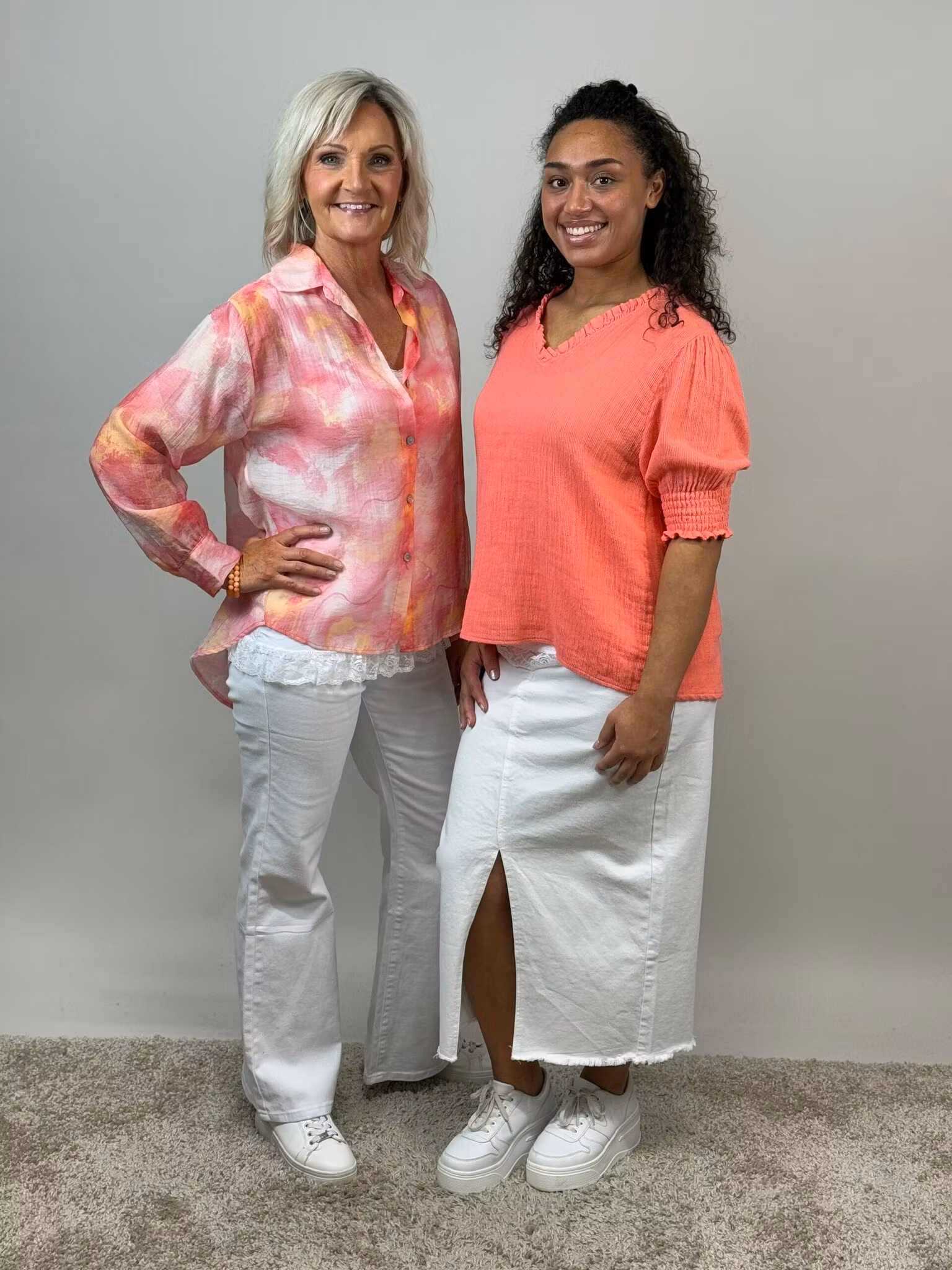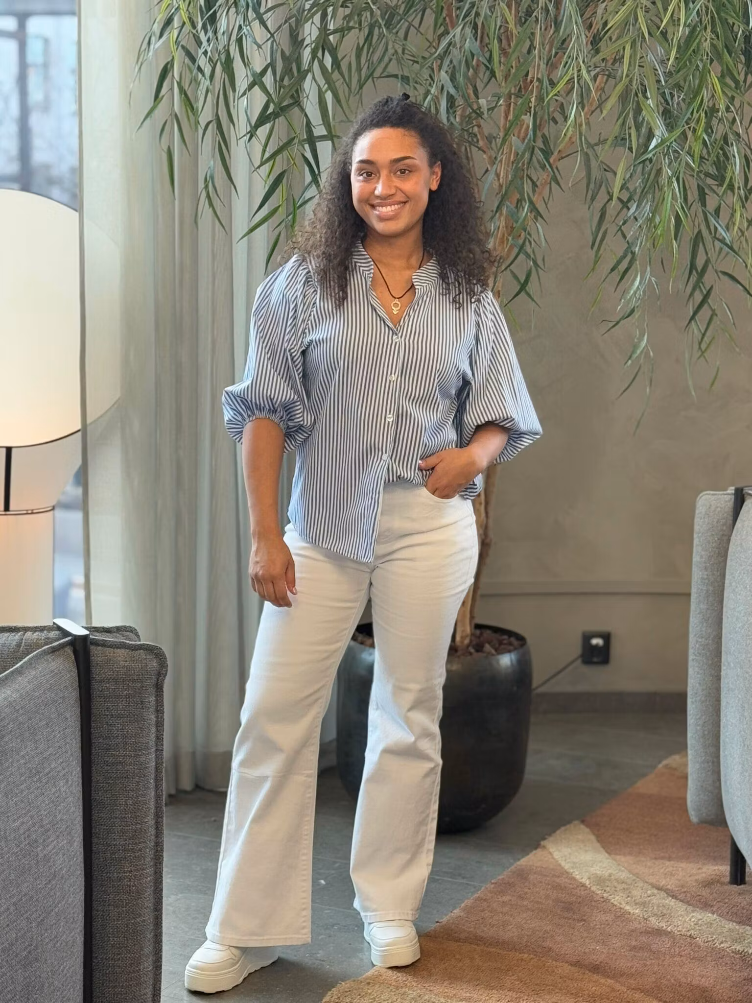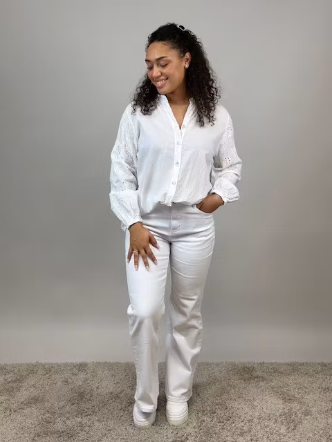Lite tunnare kritvita bomullsjeans med hög midja i flare modell. Fickor fram och bak, knapp och gylf och hällor för bälte.