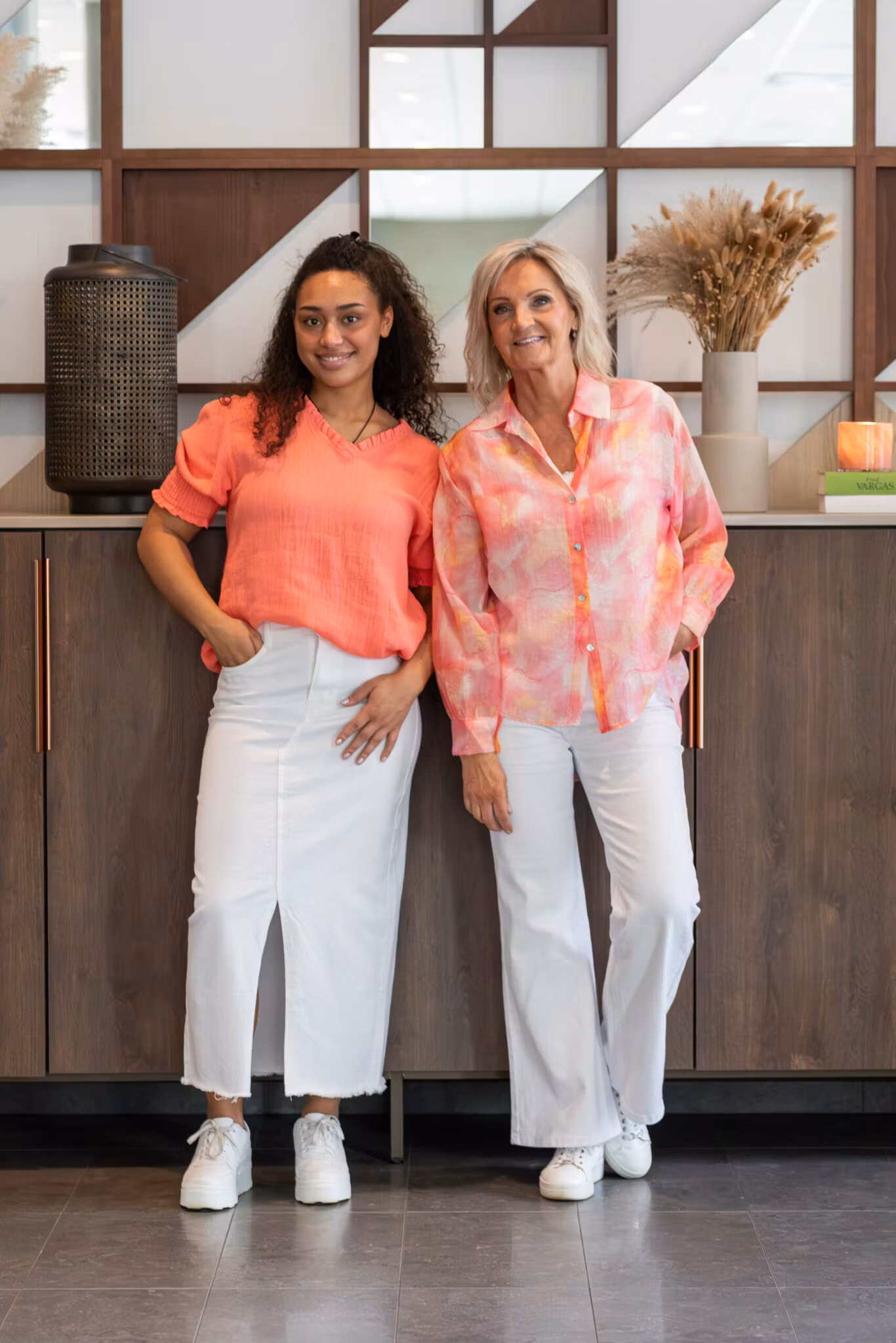 Lite tunnare kritvita bomullsjeans med hög midja i flare modell. Fickor fram och bak, knapp och gylf och hällor för bälte.Ta din vanliga storlek och pendlar du