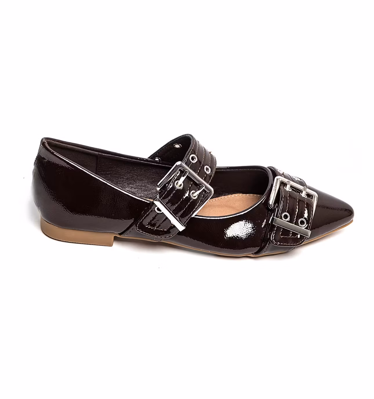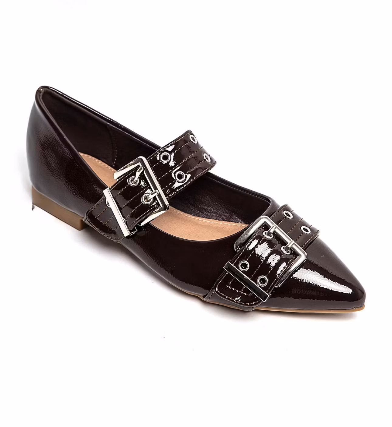 Platta sandaler med spetsig tå och två spännen som går över skon med en slingback. Super snygg och skön sko som passar till vardag och fest.