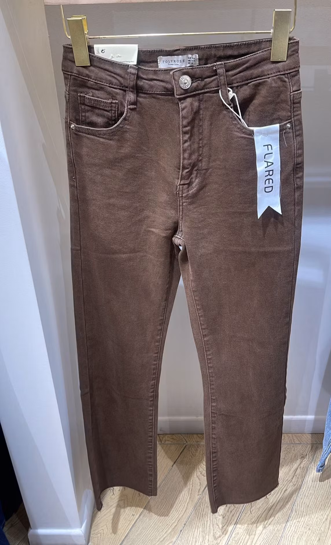 Stretchiga ankellånga jeans i en chokladbrun tvätt som är lite utsvängda med ett rått avslut. Dem sitter tajt över låren och släpper från knät. Dessa är normala i storleken men eftersom dem är stretchiga så kan du som pendlar mellan två storlekar ta din mindre. Innerbenlängd 69-70 cm.