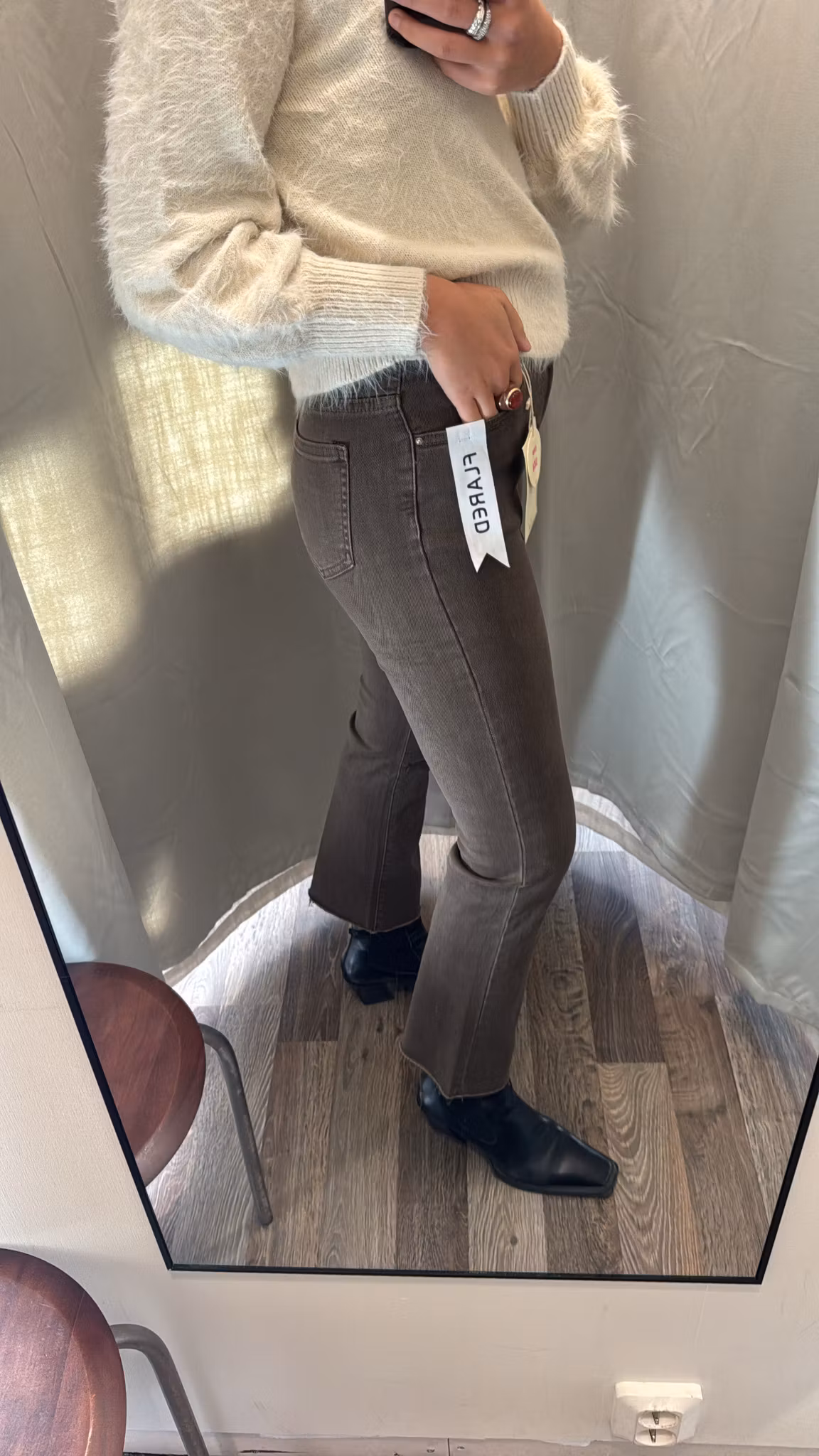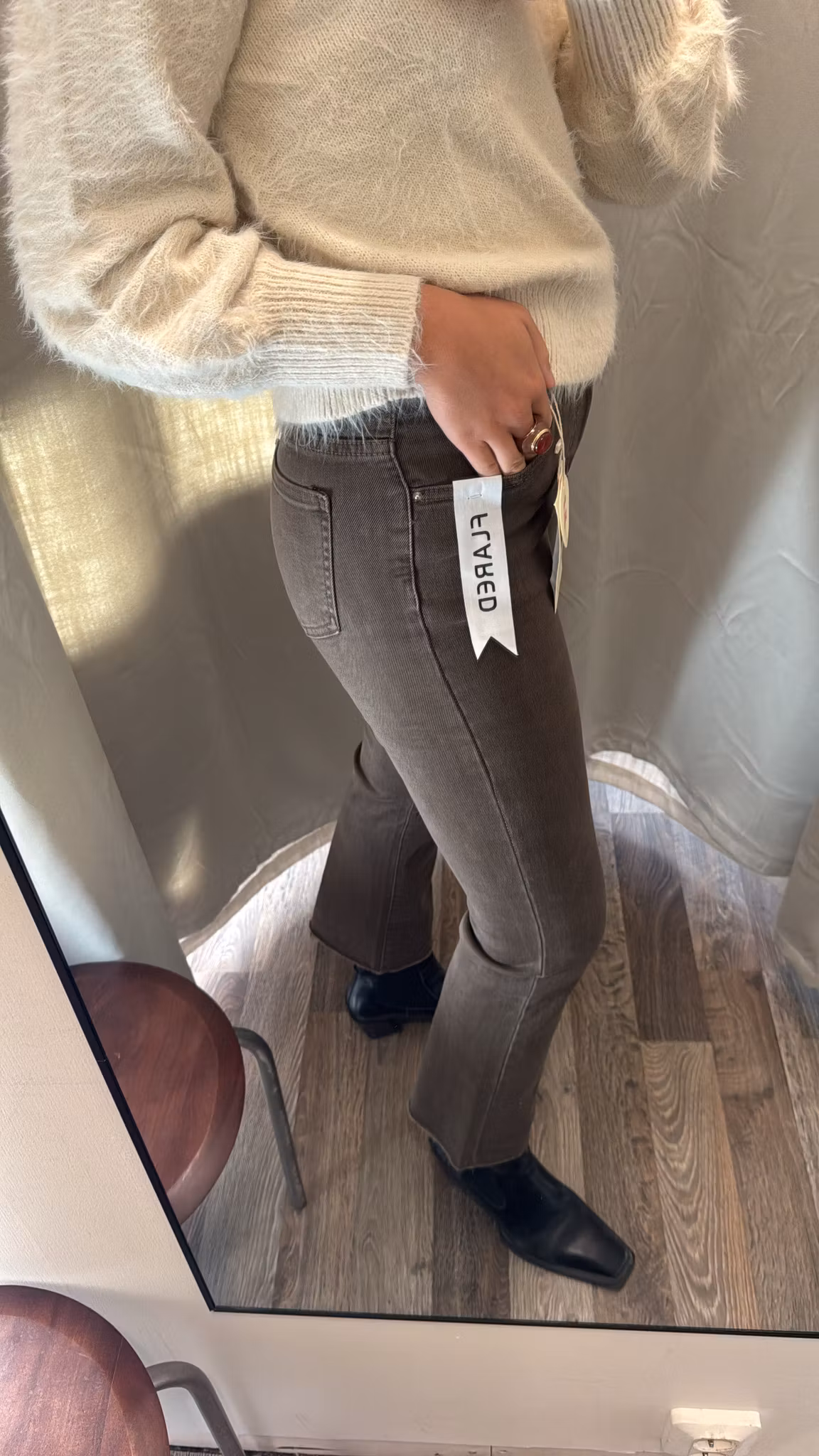 Stretchiga ankellånga jeans i en kall brun tvätt som är lite utsvängda med ett rått avslut. Dem sitter tajt över låren och släpper från knät.