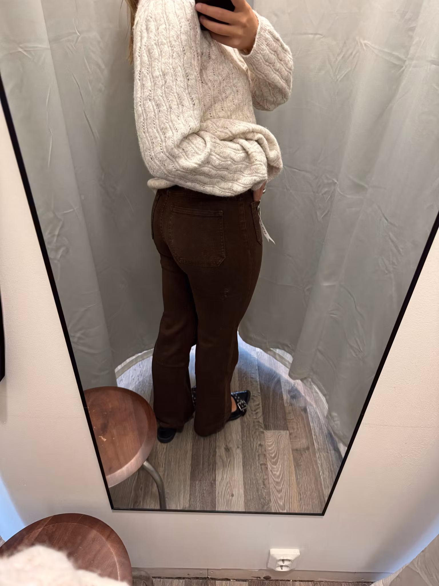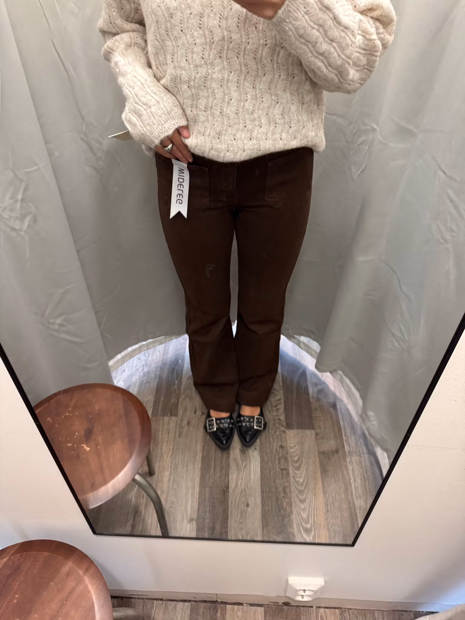 Stretchiga jeans i full-längd i en brun tvätt med roliga fickor framtill. Dem sitter tajt över låren och släpper från knät och blir helt raka. Dessa är normala i storleken men eftersom dem är stretchiga så kan du som pendlar mellan två storlekar ta din mindre.