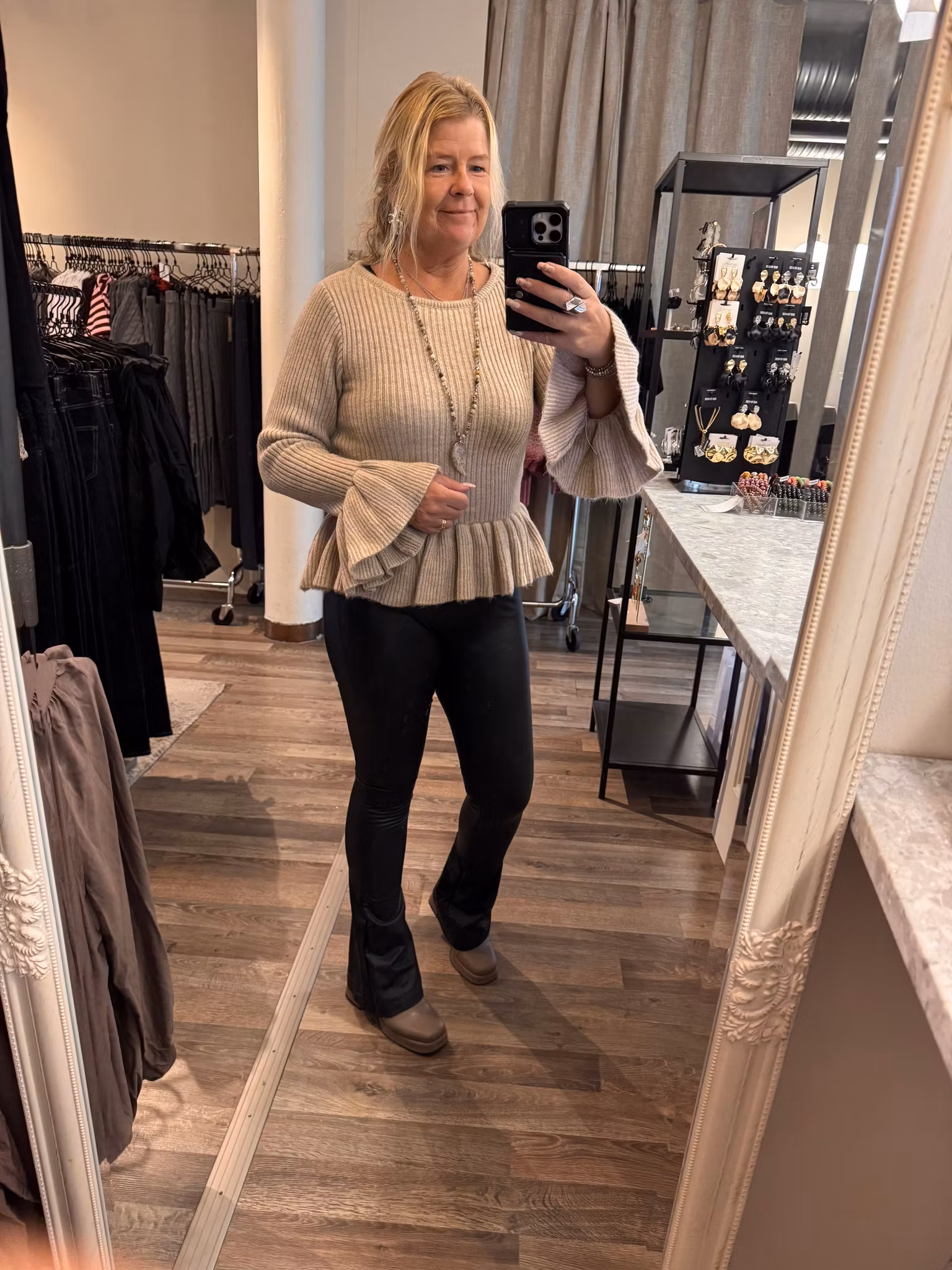 Underbar stickad topp. Bred ribbstickning, båtringning, fantastiska volanger i tröj och ärmslutet. Toppen har en markerad midja men med volangen blir det en höftlång. modell. Normal i storlek, ligger du mitt emellan två storlekar så välj din större. Sussi bär en L på bilderna