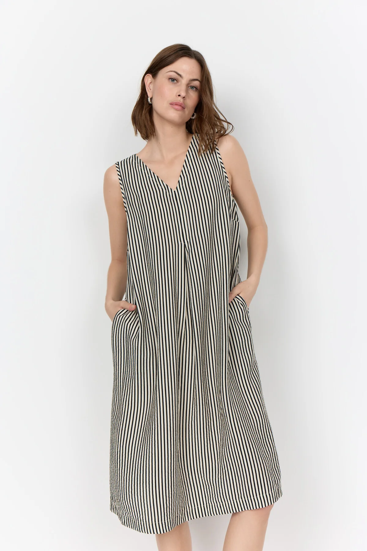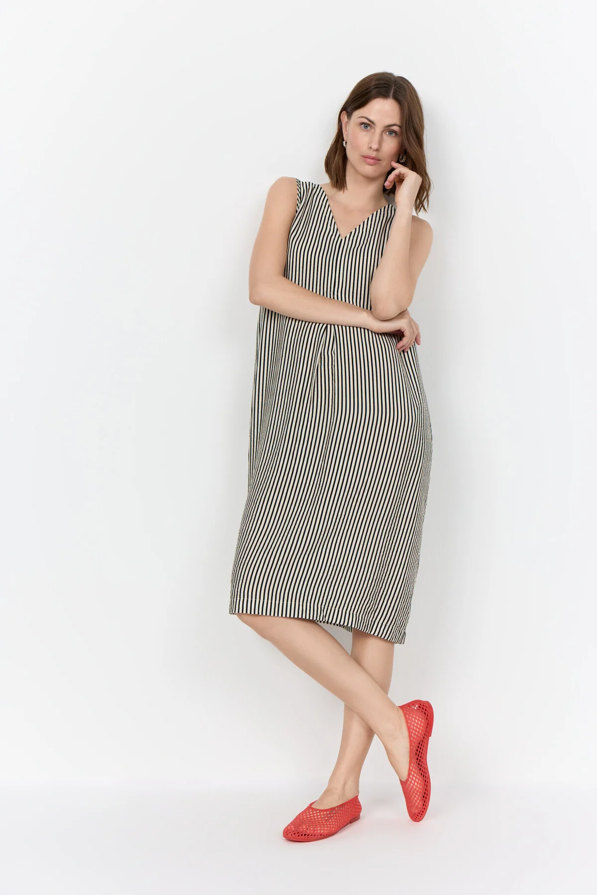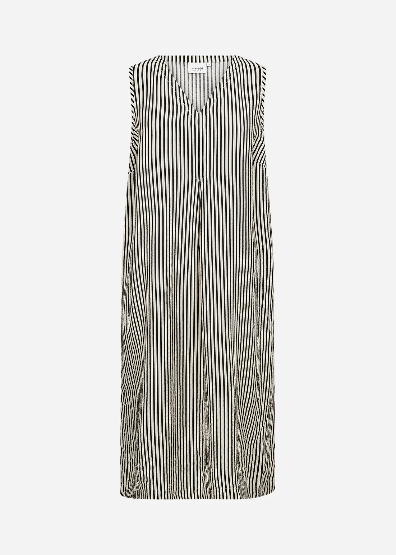 En riktigt fin klänning tillverkad av eko-viskos. Den har en ärmlös design med V-ringad hals och snygga vertikala ränder som ger en touch av elegans. Kombinera