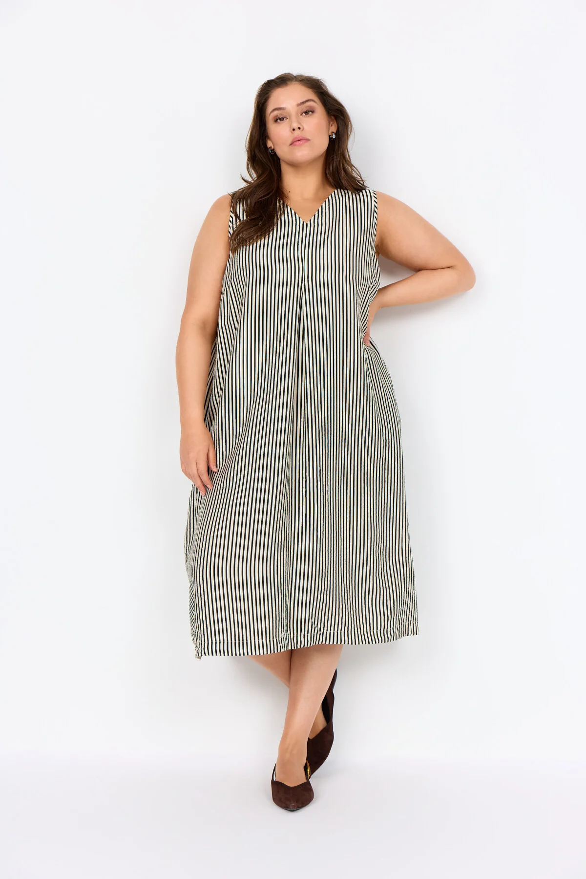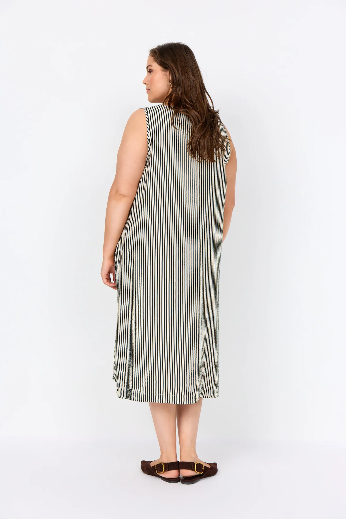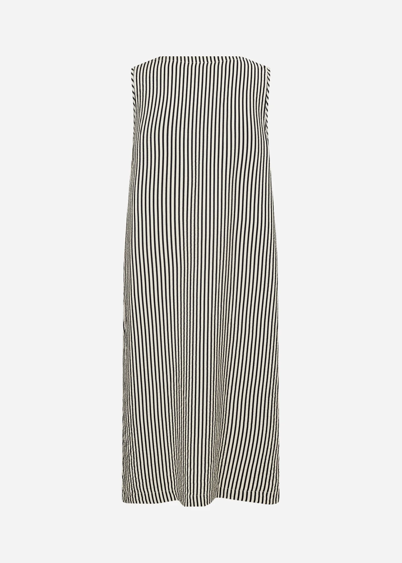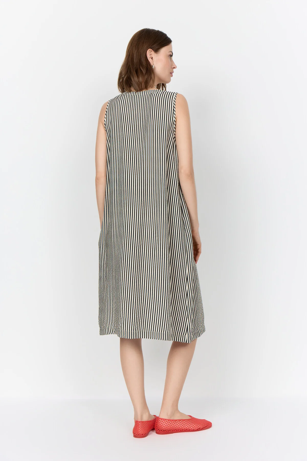 En riktigt fin klänning tillverkad av eko-viskos. Den har en ärmlös design med V-ringad hals och snygga vertikala ränder som ger en touch av elegans. Kombinera