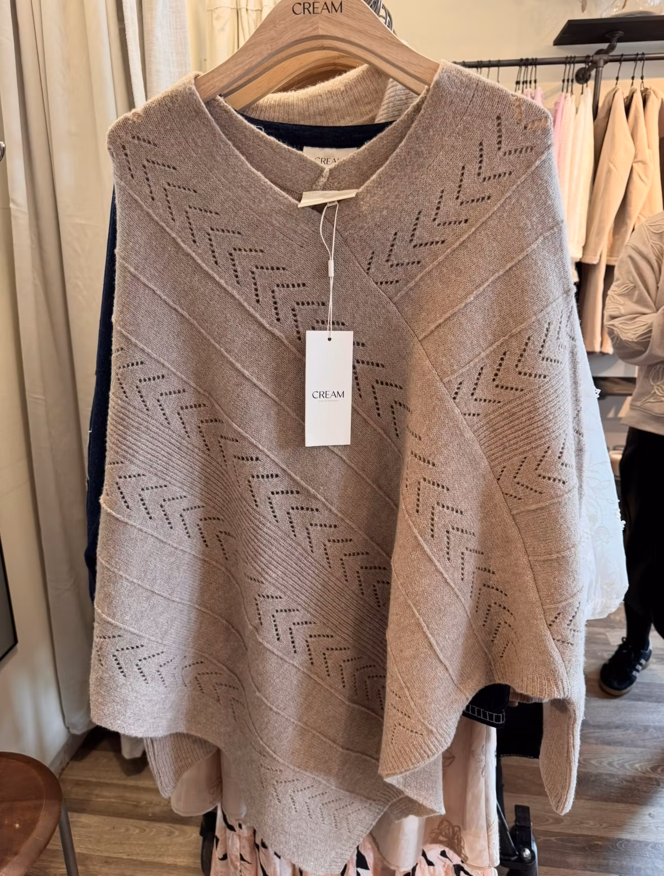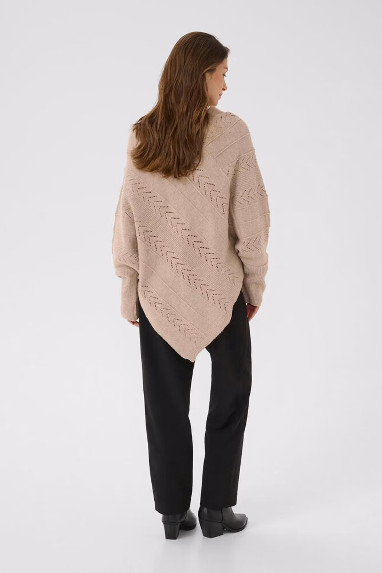 Annorlunda poncho med ärmar som gör att den inte kan snurra runt utan hålls på plats. En avslappnad passform, asymmetrisk fåll och V-ringning. Långa ärmar och subtilt stickmönster ger komfort och modern stil.