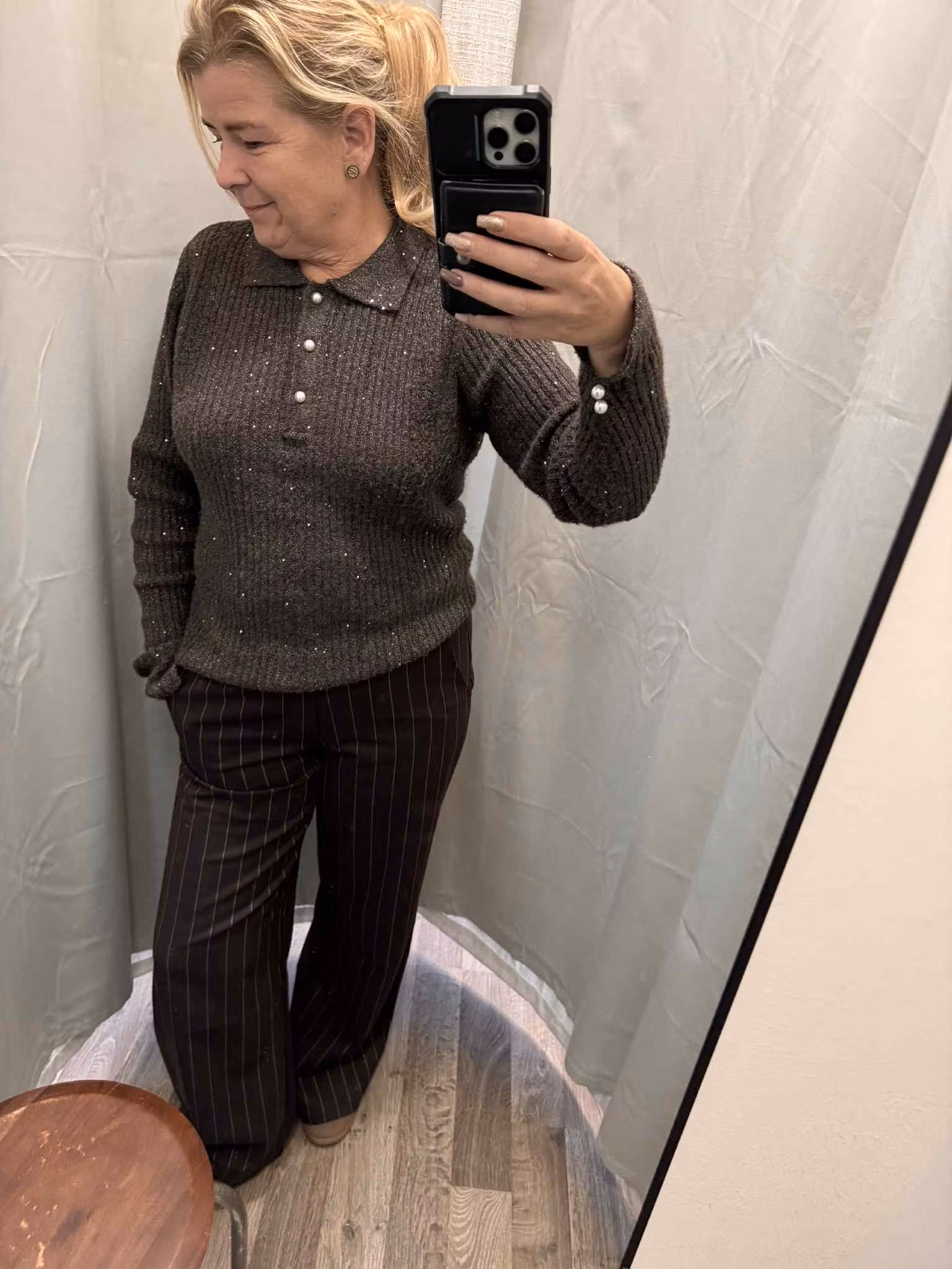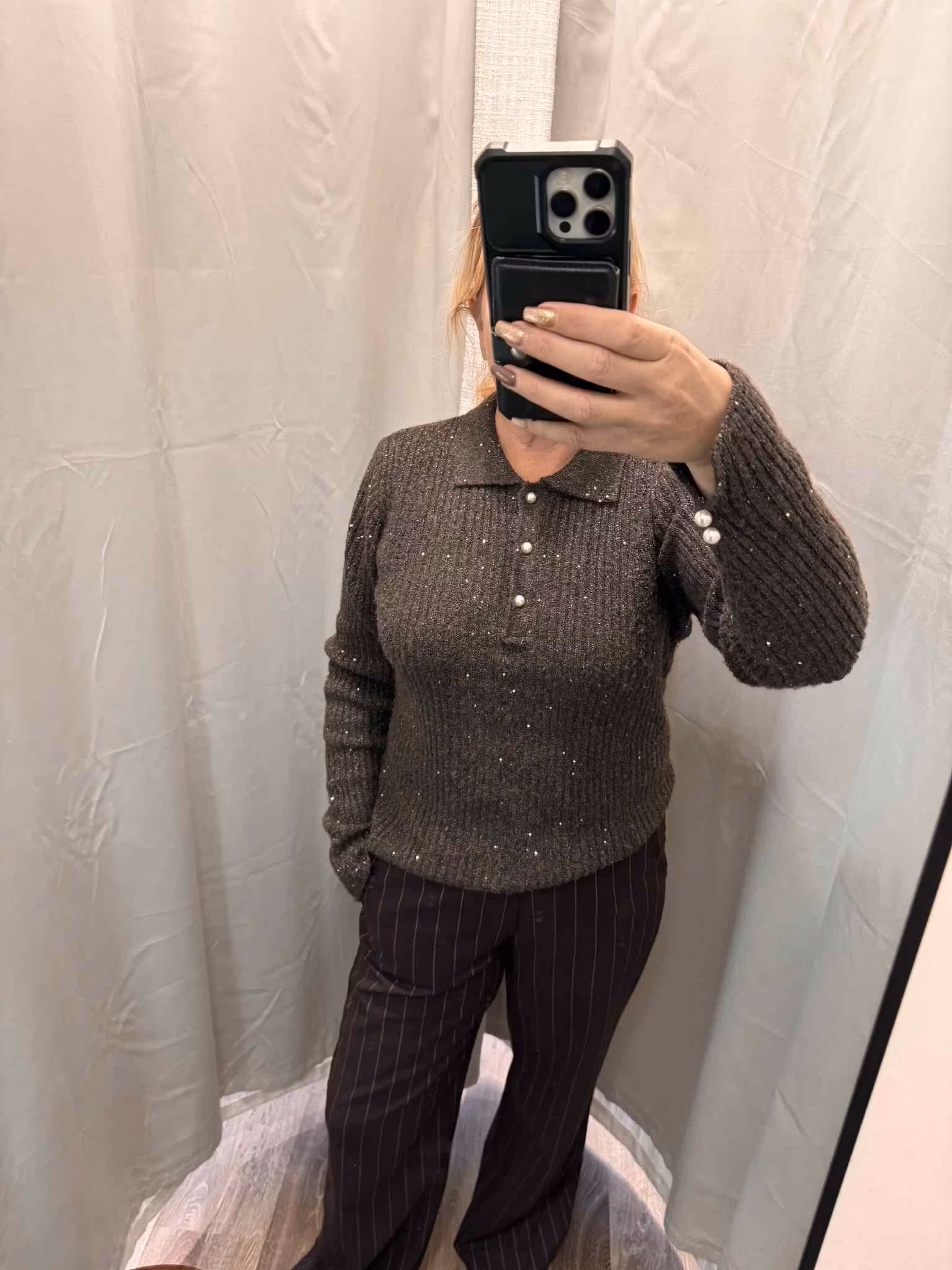 Mjuk stickad topp med krage, knappar som är pärlor, slits i ärmslutet och i ribbningen är det både lurex och paljetter. Den glittrar alldeles lagom! Den är en kroppsnära modell men super stretchig så är du alltid samma storlek ta den och pendlar du kan du både ta din mindre och större.