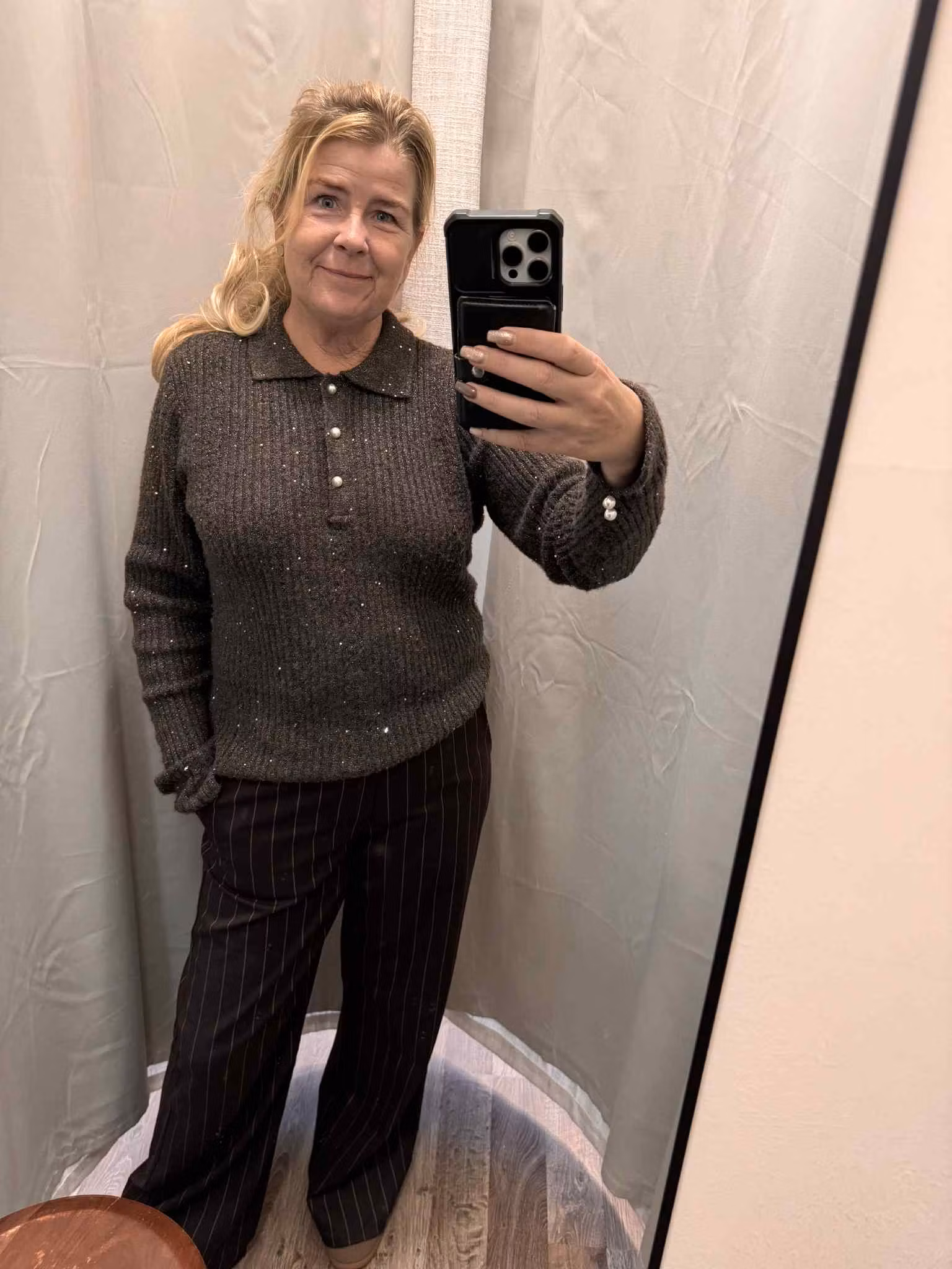 Mjuk stickad topp med krage, knappar som är pärlor, slits i ärmslutet och i ribbningen är det både lurex och paljetter. Den glittrar alldeles lagom!