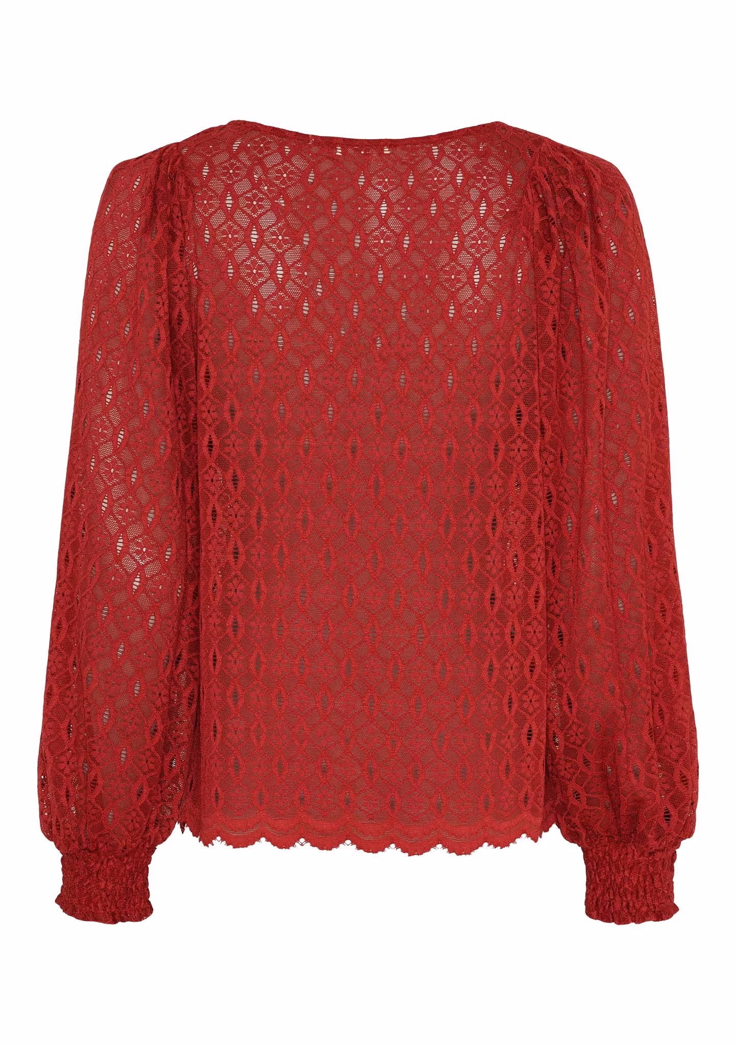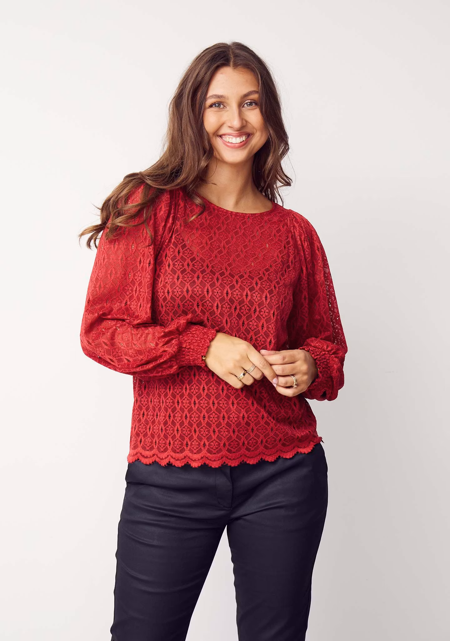 Ljuvlig spetsblus med lite transparens och en bekväm, ledig passform. De långa raglanärmarna skapar en mjuk drapering och avslutas med smockärmslut.