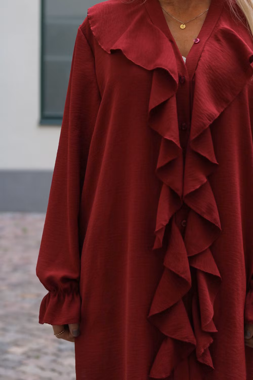 Onesize klänning med fin volang på hela framsidan med en knapprad i mitten så kan man bära den öppen, V-ringad, resår i ärmslutet och en fin volangkant. Denna funkar för stl 34/36-42. Längd axel och ner: Fram: ca 89 cm, 96 cm bak.