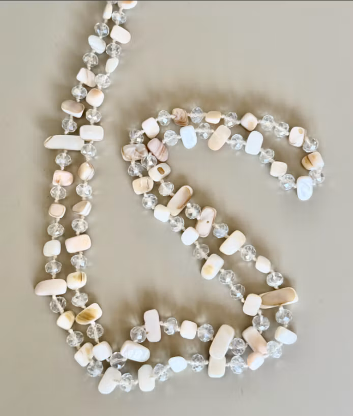 120 cm långt halsband i beige och vit med snäckskal. Går att vira ett varv runt huvudet för att få två olika längder. Så fint att klä upp och ner.