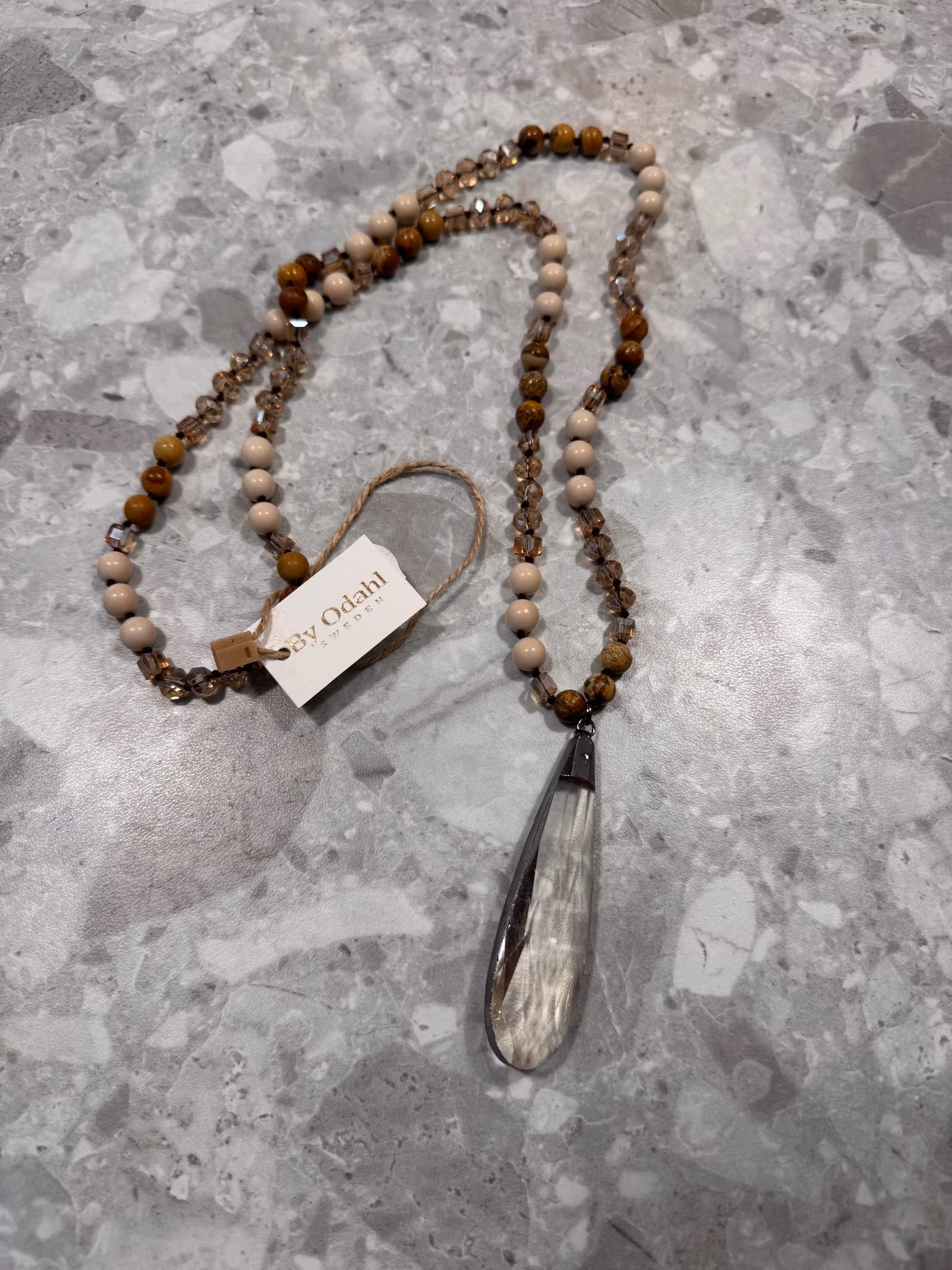 90 cm långt pärlhalsband i bruna och vita toner med en stor glassten/prisma längst ner. Så fint att klä upp en annars vardaglig outfit. Nickelfritt