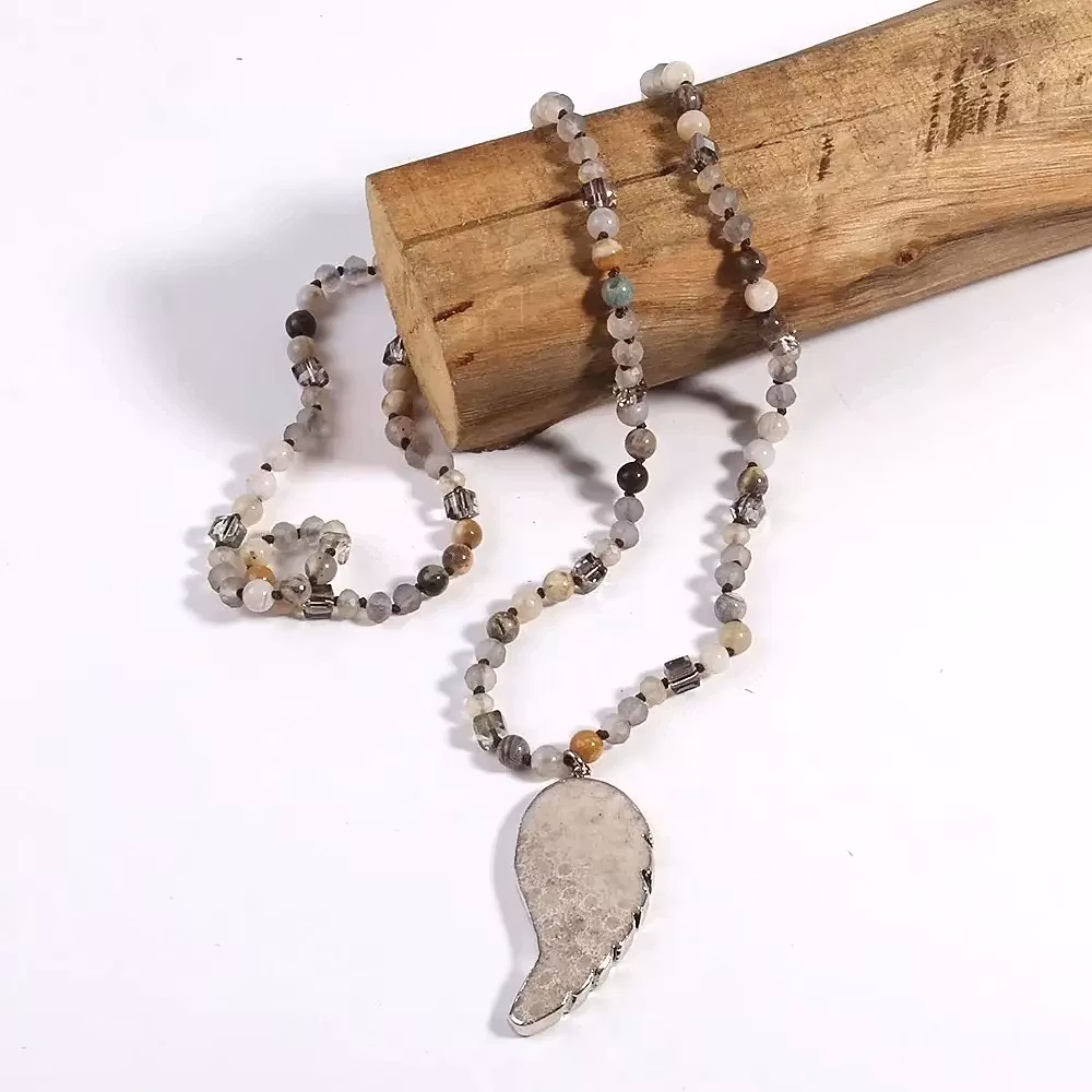90 cm långt pärlhalsband i gråa och beige toner med en stor glassten i form av ett taggigt löv med silver på kanten.