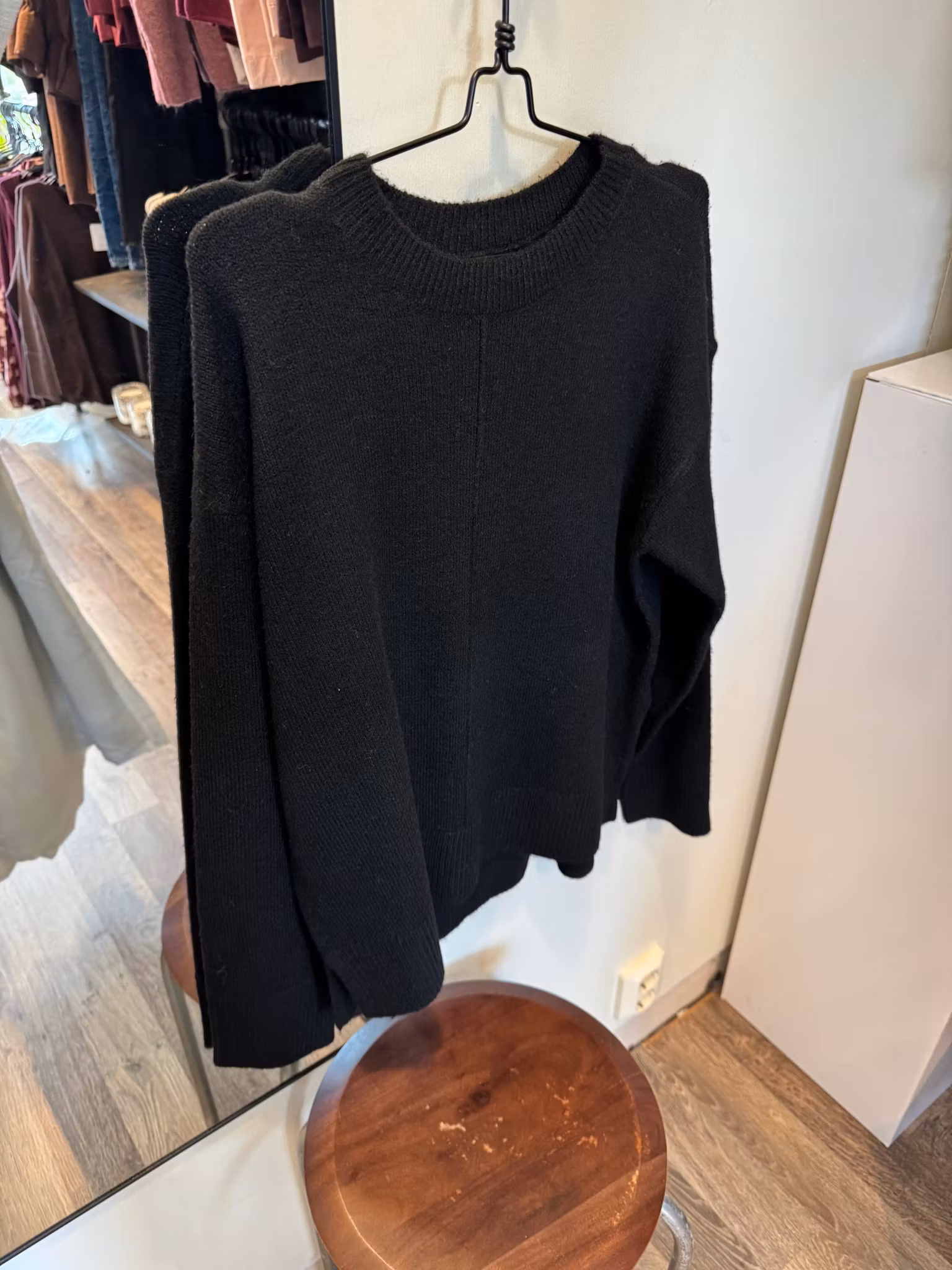 Mjuk och skön stickad tröja med rundad hals, raka ärmar och slits i sidan. En fin detalj på tröjan är sömmen framtill som ger en extra touch. Normal i storleken.