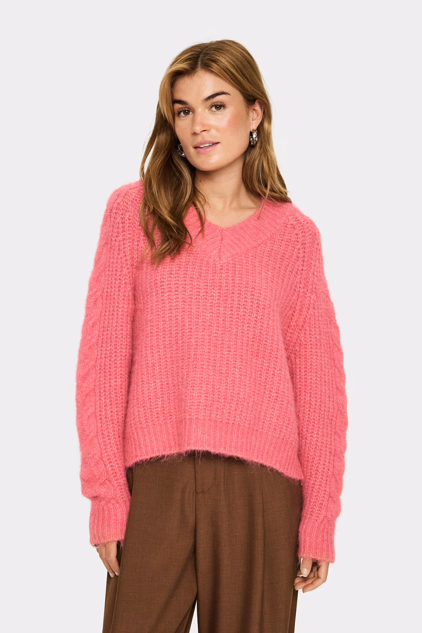 Stickad tröja i knallig rosa färg, V-ringad, flätat mönster på ärmarna och ribbade muddar. Super snygg att styla med en skjorta under eller till en kjol.