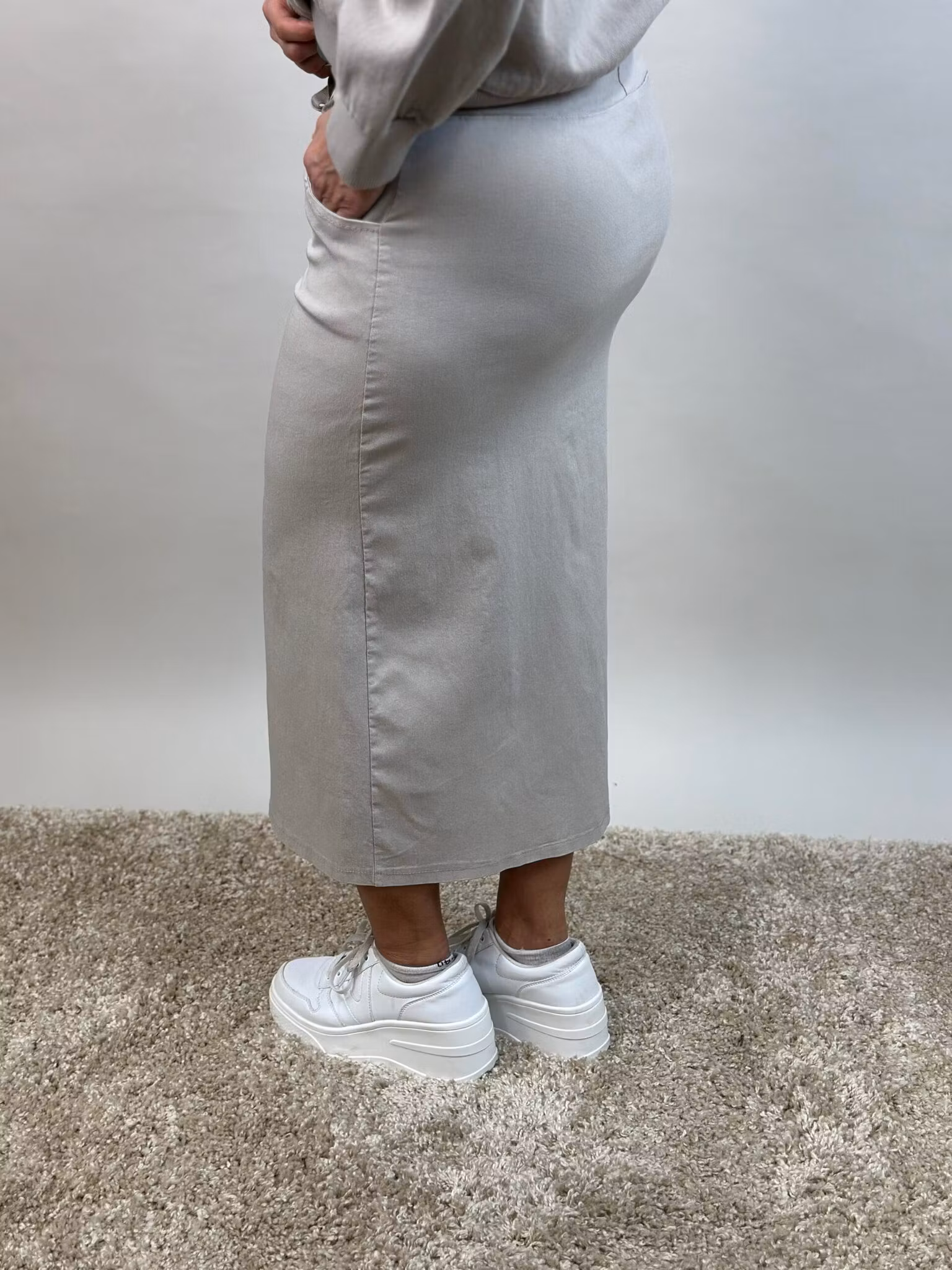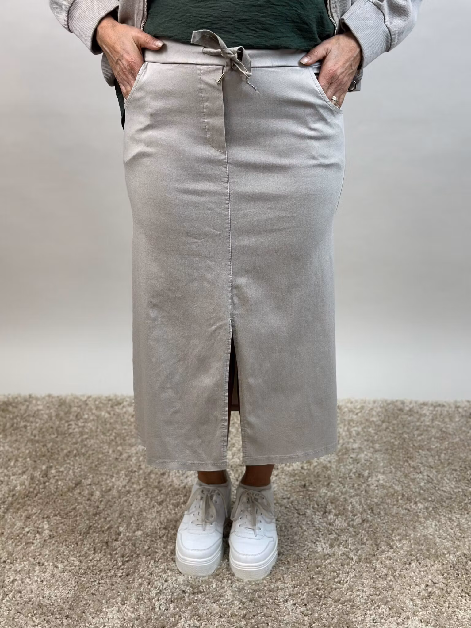 Magisk stretchkjol med resår och dragsko i midjan. Fickor fram och slits framtill.