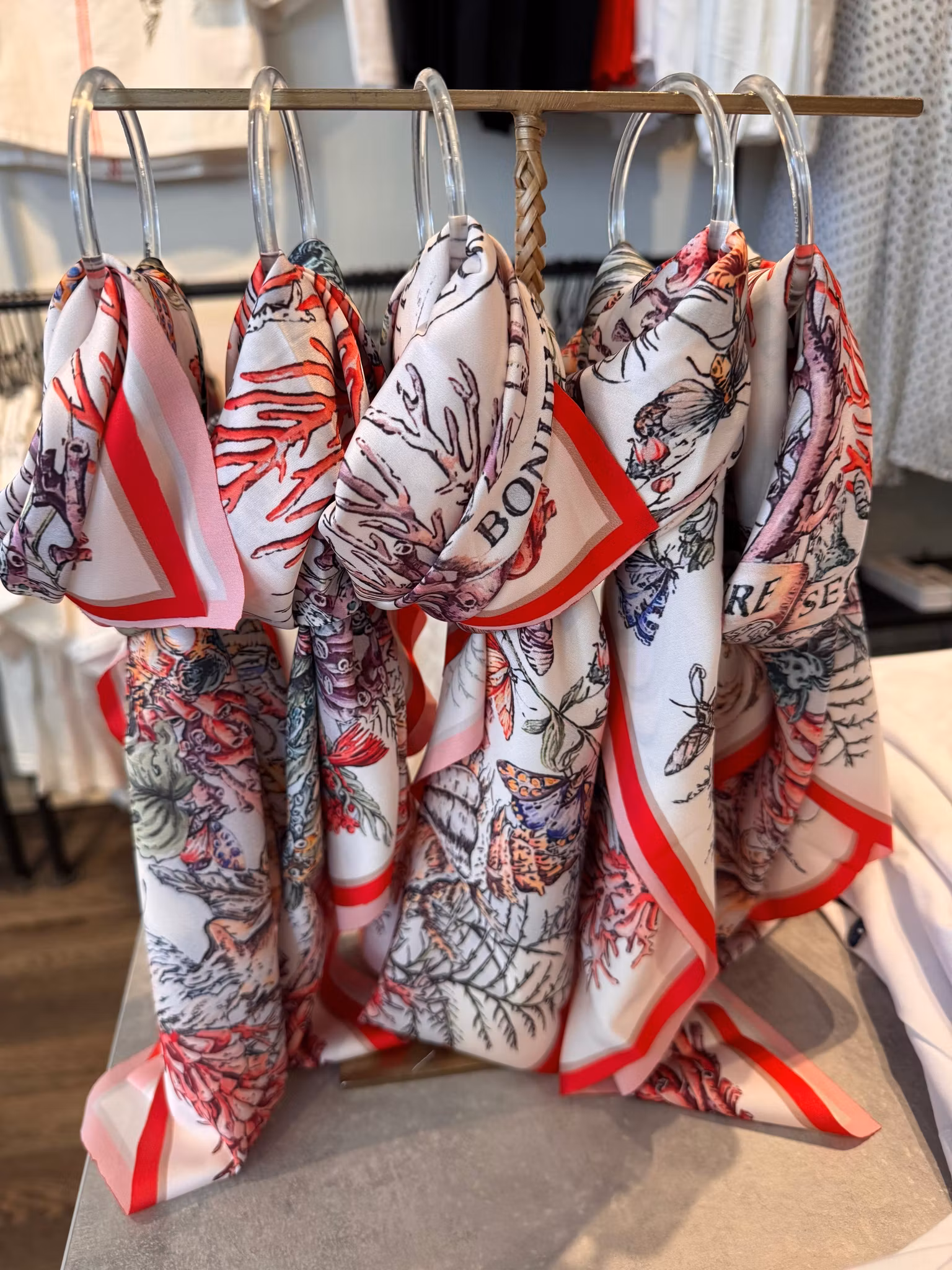 Underbar satinscarf med print av havets koraller, sjöhästar mm men också grodor, insekter och växter. Så vacker och klar i färgernaMått: 70x70Märke: Minou Minou