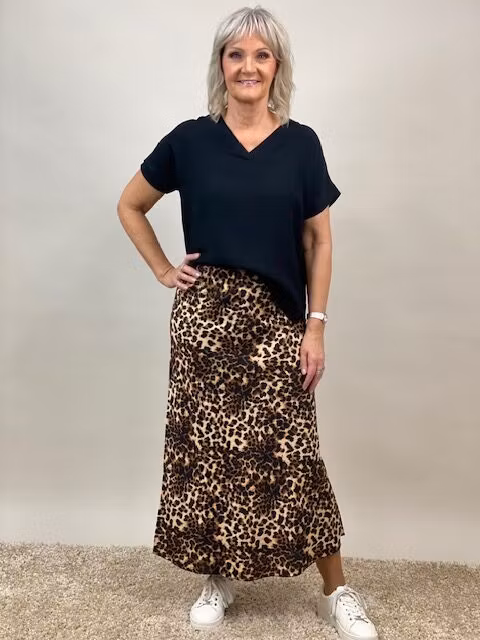 Snygg viskoskjol i fullängd med resår i midjan. Onesize passar 34/36-42.