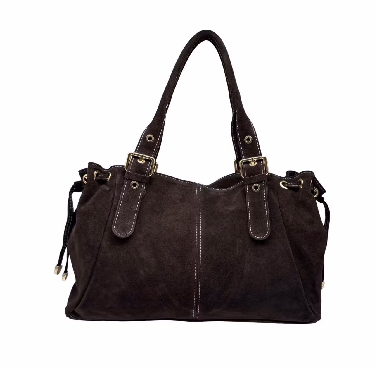 En magiskt snygg mockaväska/bag med ställbara axelband tillverkad i Italien. En dragkedja att försluta väskan med. Två stora fack inuti med en avskiljande som även den har dragkedja för förvaring, ett litet fack inne med dragkedja samt två fickor. Även ett fack på baksidan med dragkedja.