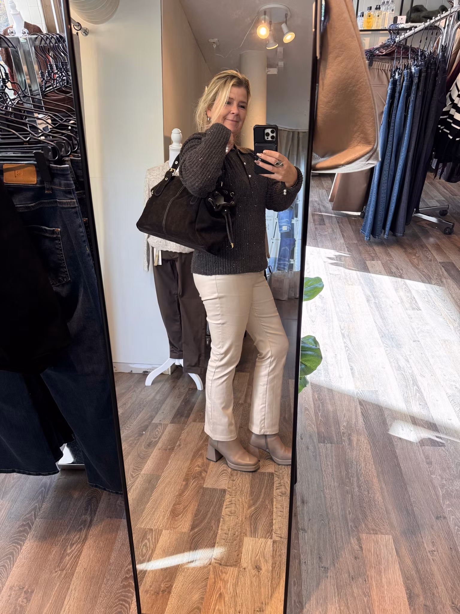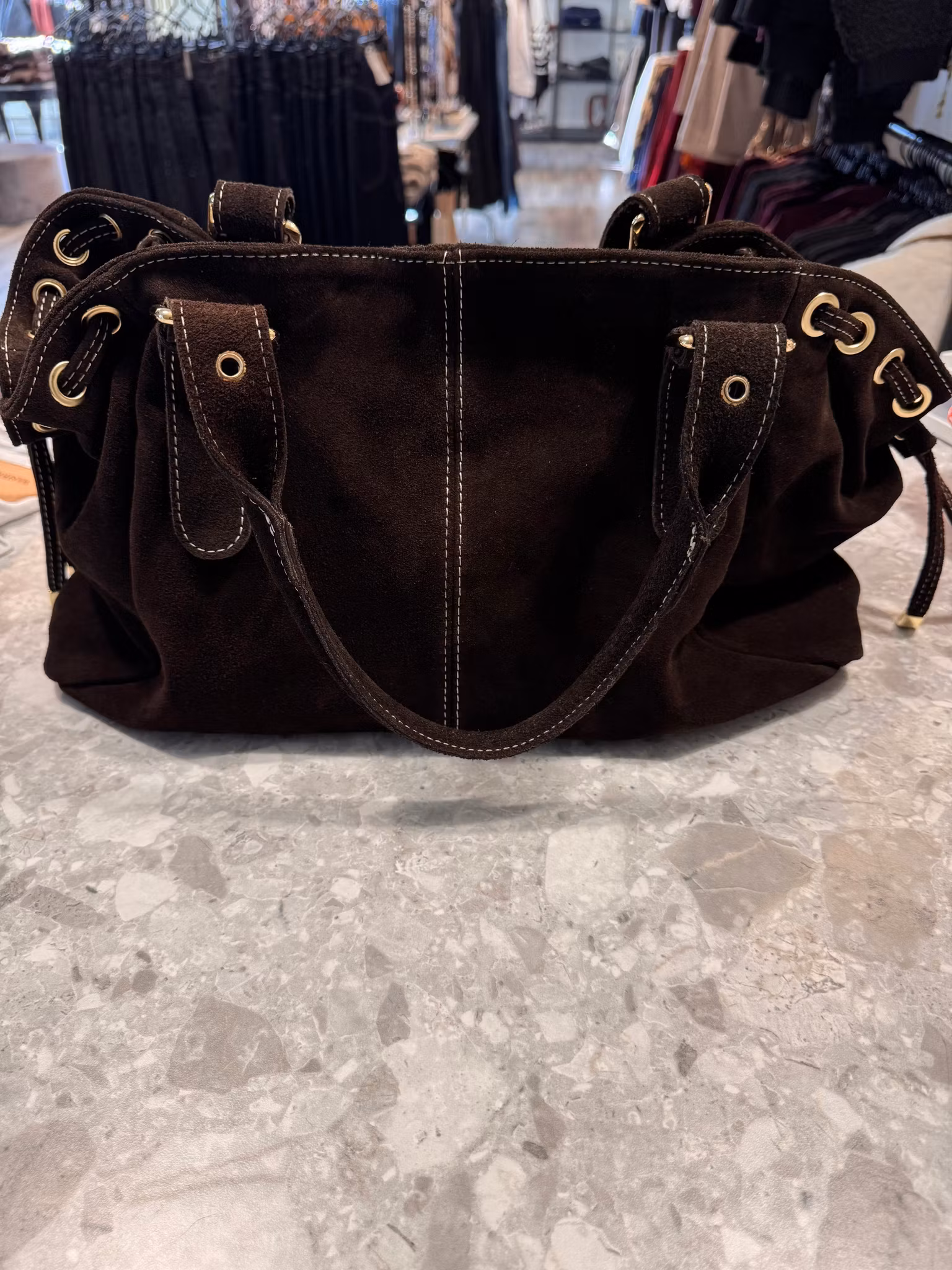 En magiskt snygg mockaväska med en fast axelrem tillverkad i Italien. Ett litet fack inne med dragkedja samt två fickor.