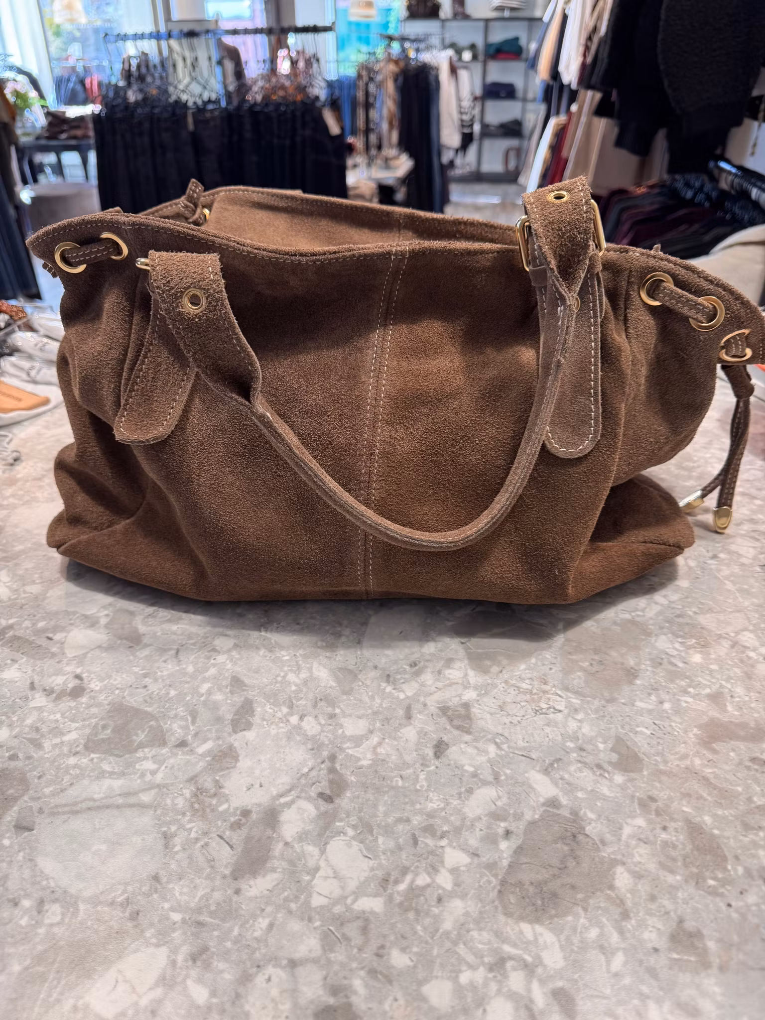 En magiskt snygg mockaväska med en fast axelrem tillverkad i Italien. Ett litet fack inne med dragkedja samt två fickor.