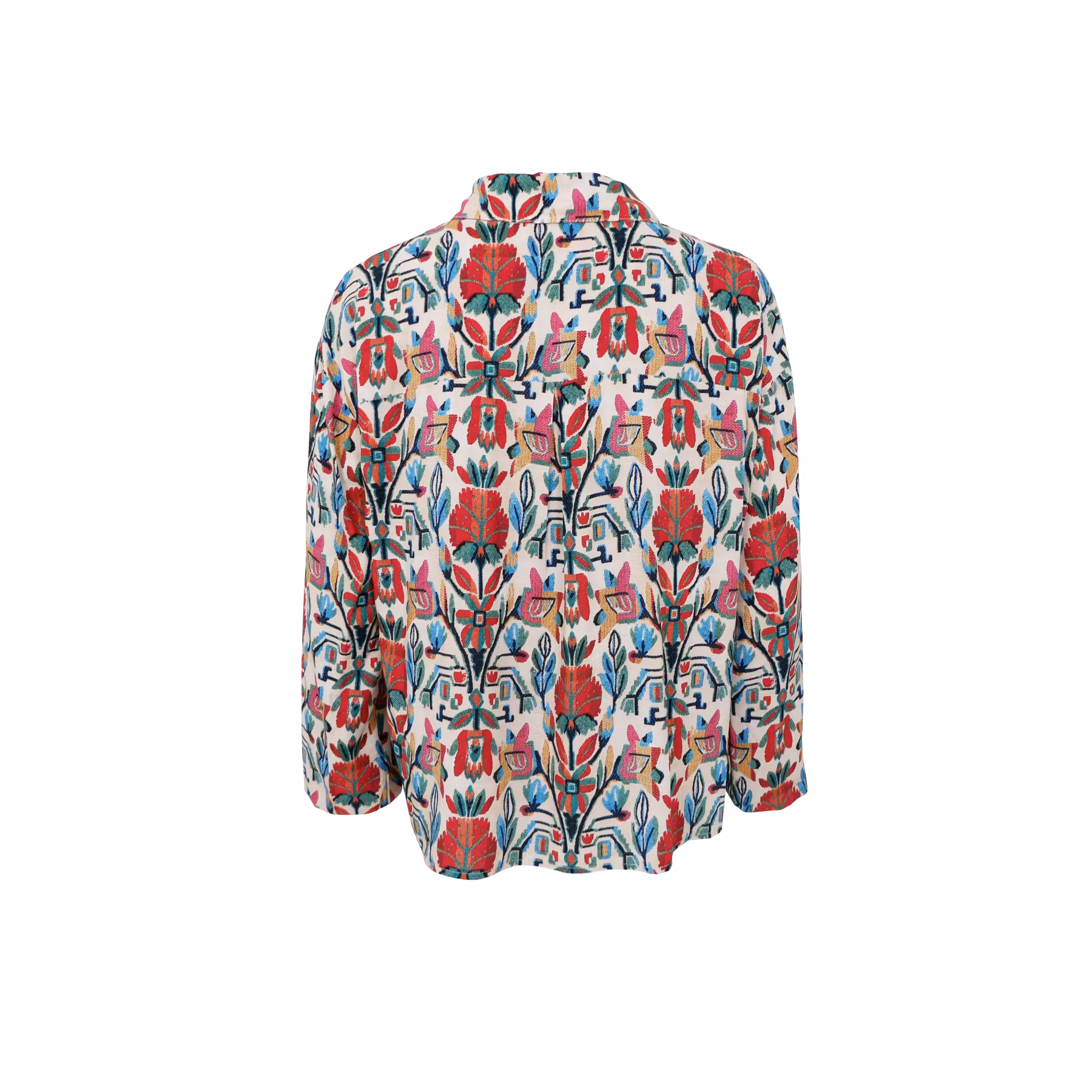 Mönstrad blus som ser ut som brodyr men är bara ett print, knappar, krage och en lös passform. Snygg till både jeans men också ljus nederdelar. Finns massa färger att plocka upp i denna blus, styla med ett rött linne under och denna öppen - finns massa olika stylings möjligheter med denna blus. Rymlig, S/M går upp till stl 40 och L/XL går upp till stl 44
