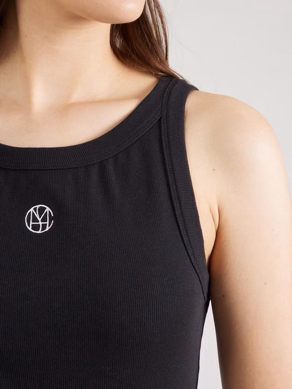 Ribbat svart linne med MSCH Copenhagens logga framtill som ger en lyxig detalj. Super snygg att ha under kavajer eller bara som den är på sommaren. Mjuk och stretchig, normal i storleken.